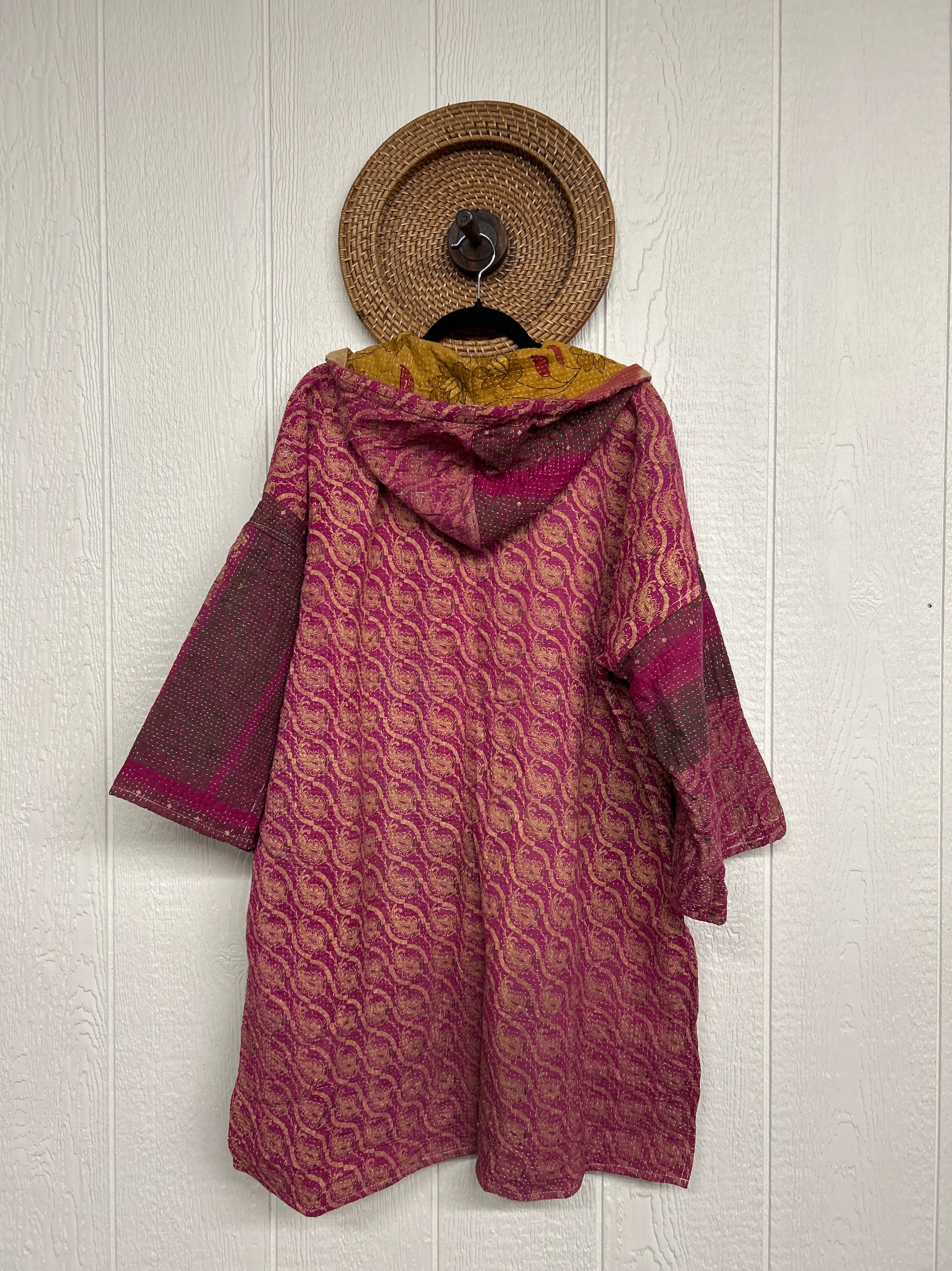 Cozy up in our Half Moon Shacket! Crafted from our ultra lux fine kantha stitched vintage cotton sari, the Half Moon Shacket features a hood, Button-down placket, deep front pockets and bell sleeves.