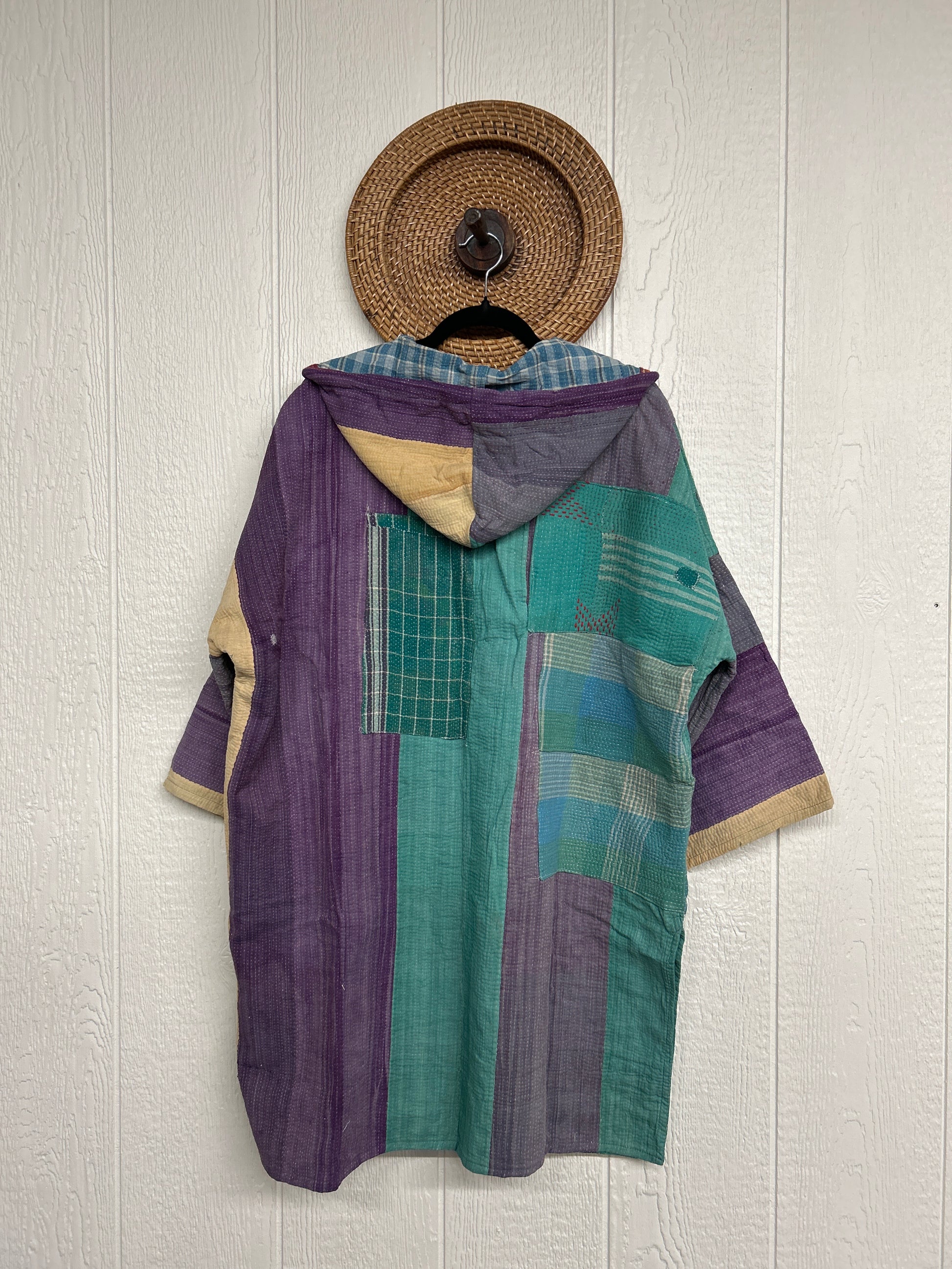 Cozy up in our Half Moon Shacket! Crafted from our ultra lux fine kantha stitched vintage cotton sari, the Half Moon Shacket features a hood, Button-down placket, deep front pockets and bell sleeves.