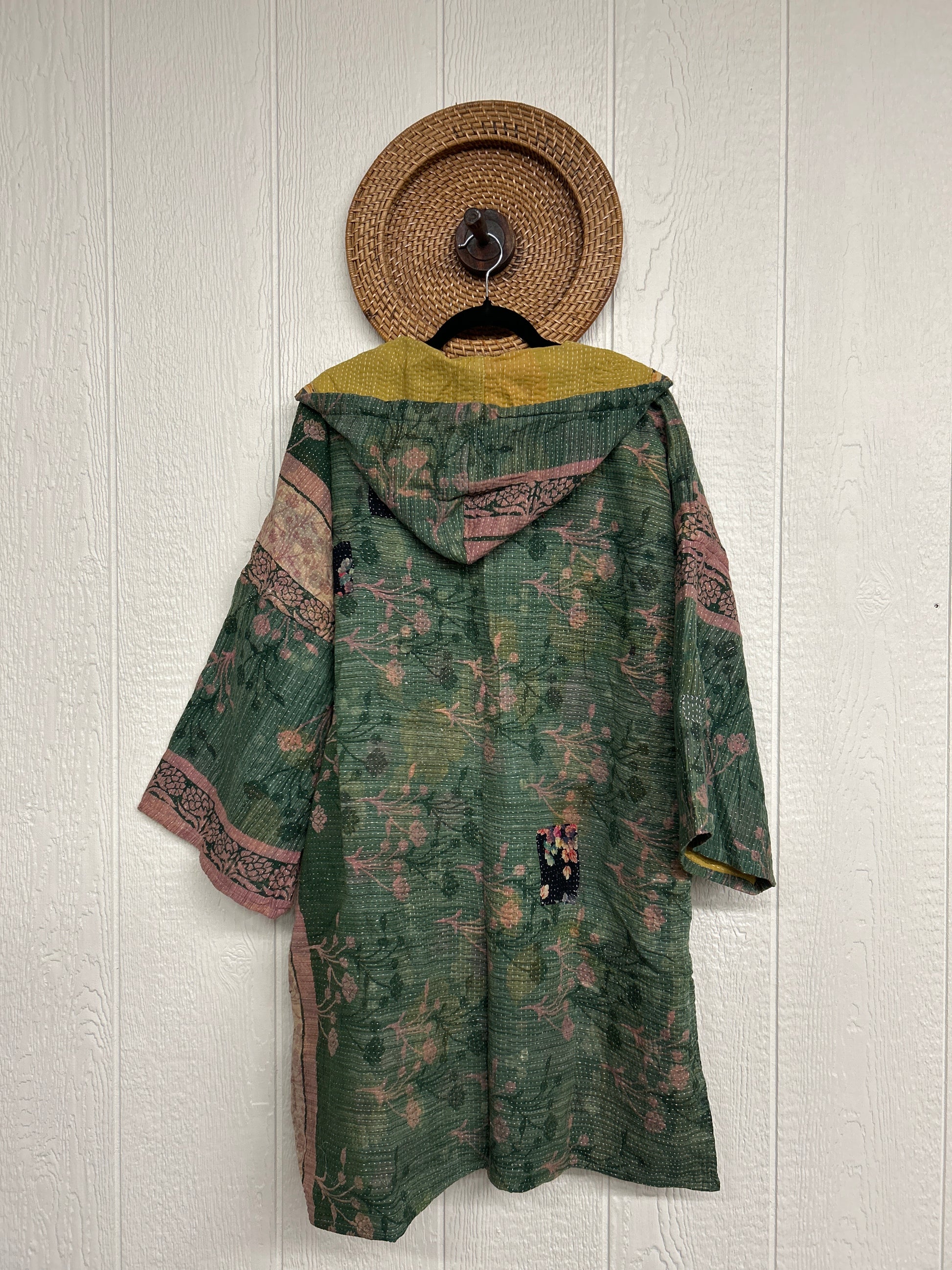 Cozy up in our Half Moon Shacket! Crafted from our ultra lux fine kantha stitched vintage cotton sari, the Half Moon Shacket features a hood, Button-down placket, deep front pockets and bell sleeves.