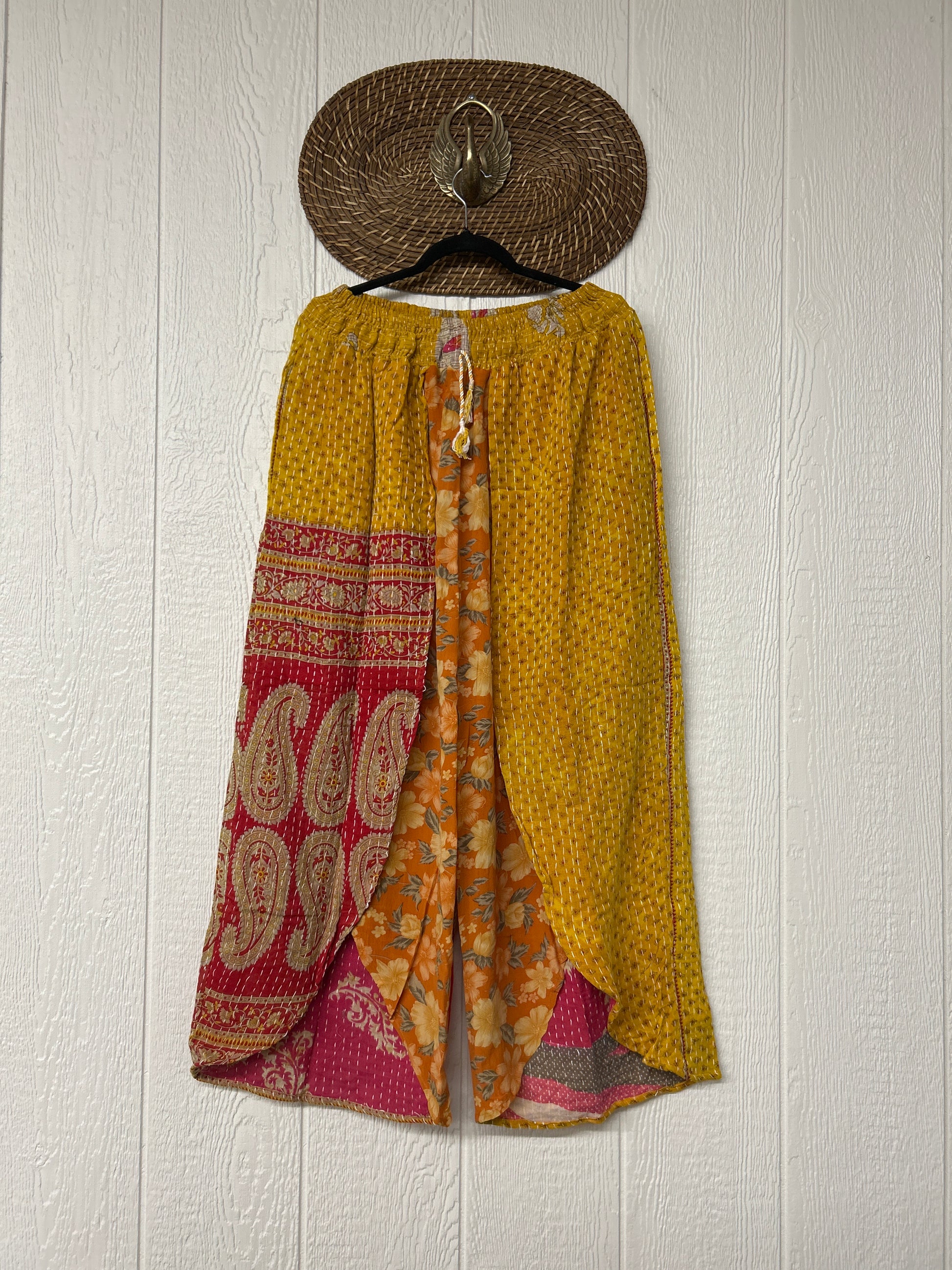 Crafted from our lux kantha stitched vintage cotton sari these dream pants feature a split tulip leg with a crepe silk inner panel, interior pockets & stretchy waistband with a drawstring.