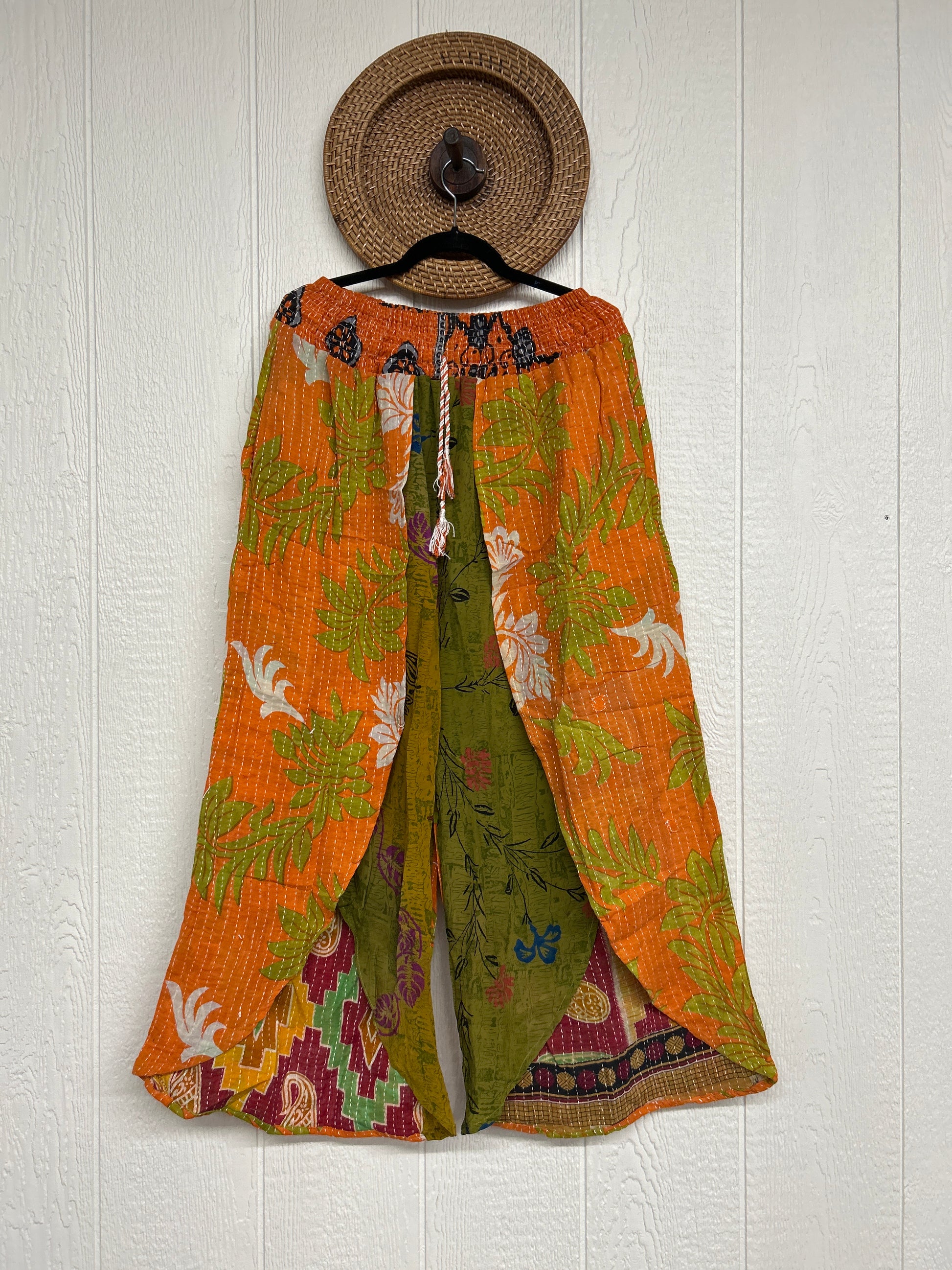 Crafted from our lux kantha stitched vintage cotton sari these dream pants feature a split tulip leg with a crepe silk inner panel, interior pockets & stretchy waistband with a drawstring.