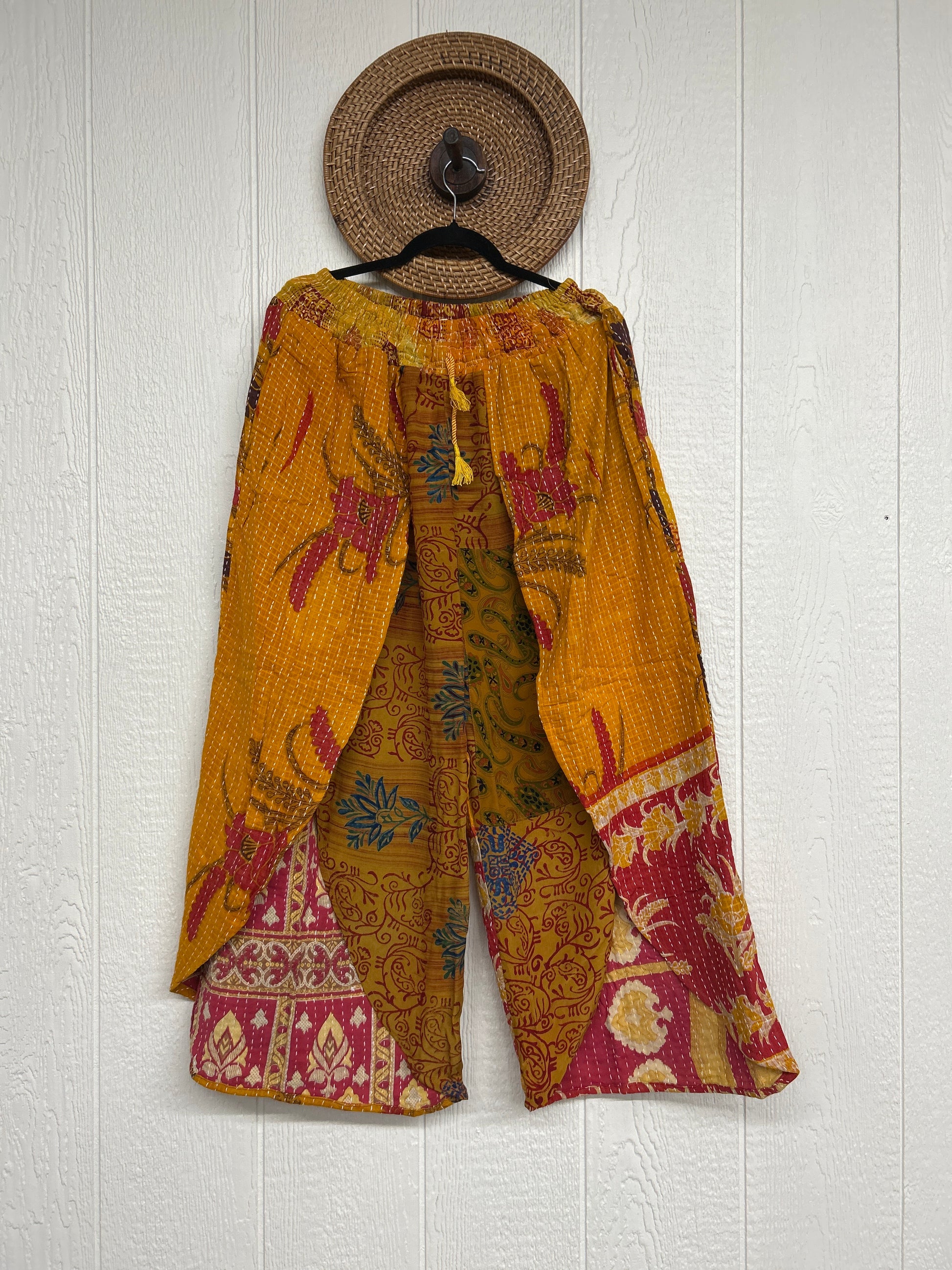 Crafted from our lux kantha stitched vintage cotton sari these dream pants feature a split tulip leg with a crepe silk inner panel, interior pockets & stretchy waistband with a drawstring.