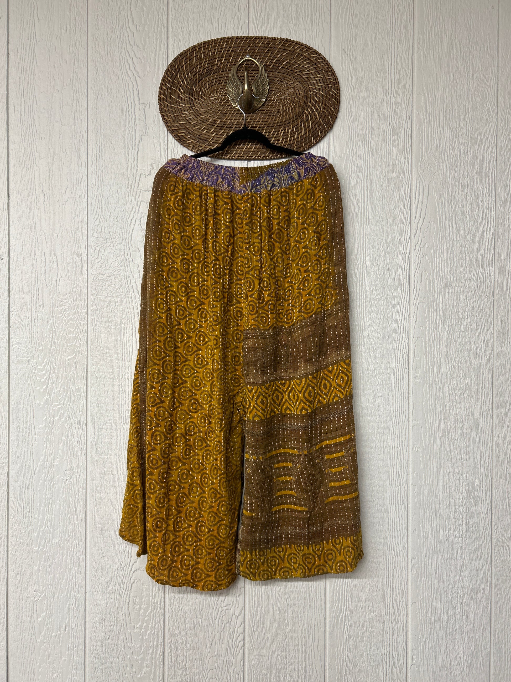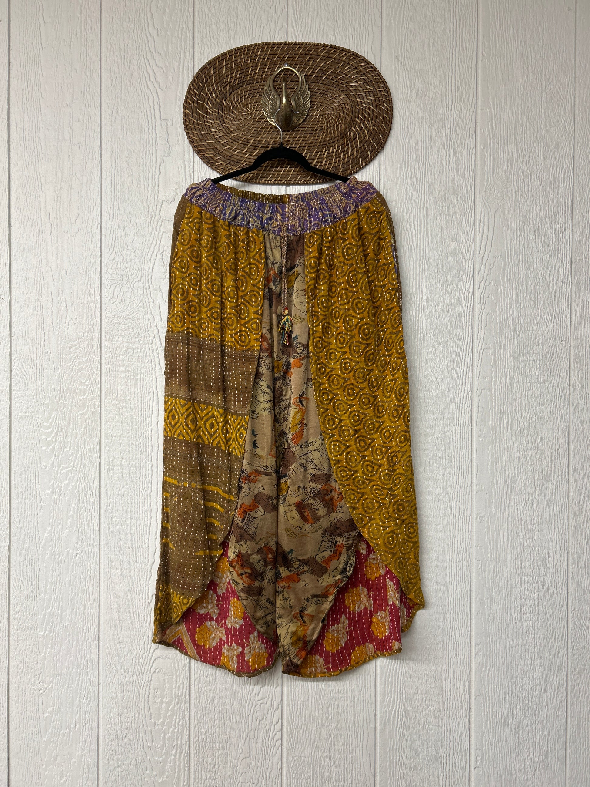 Crafted from our lux kantha stitched vintage cotton sari these dream pants feature a split tulip leg with a crepe inner panel, interior pockets & stretchy waistband with a drawstring.