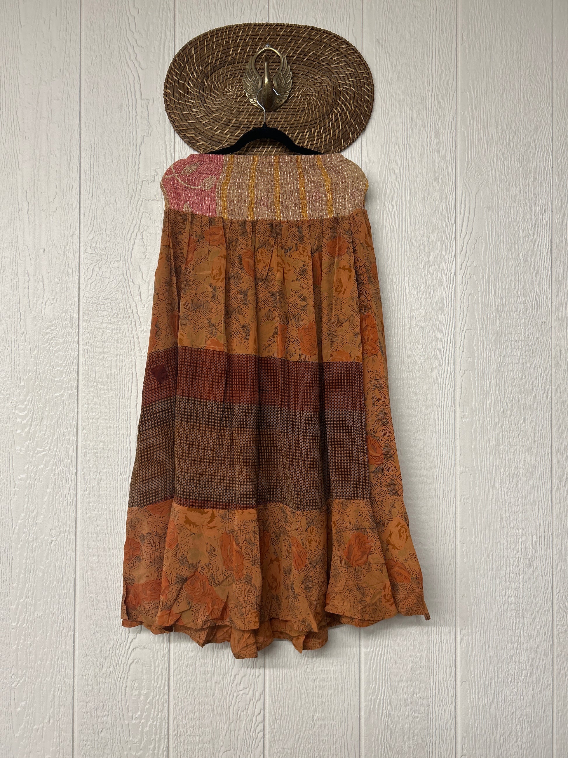 Crafted from vintage crepe sari this ethereal piece features a curved front wrap panel tacked on to the stretchy kantha waistband creating a flirty silhouette fit for a rockstar.