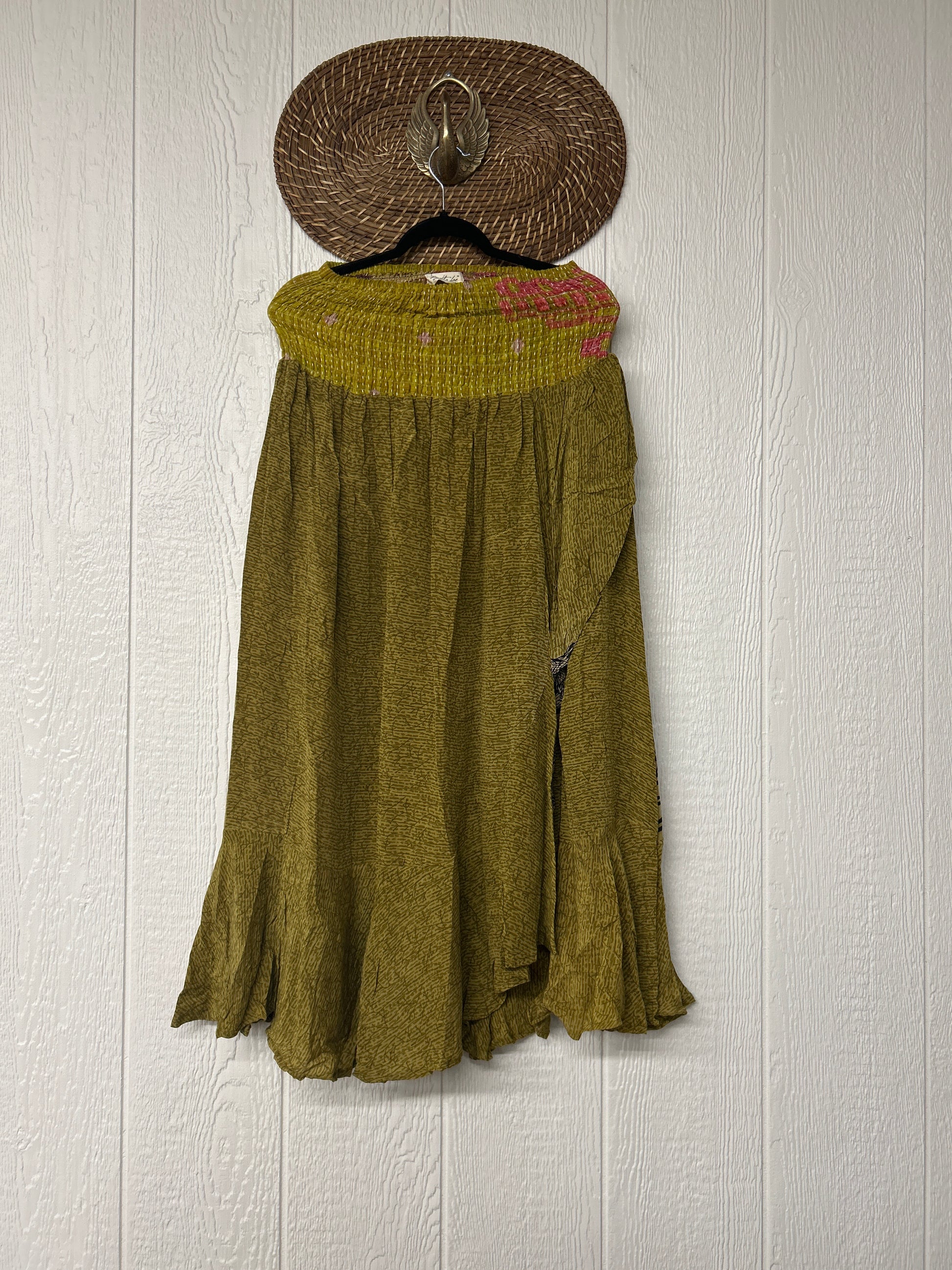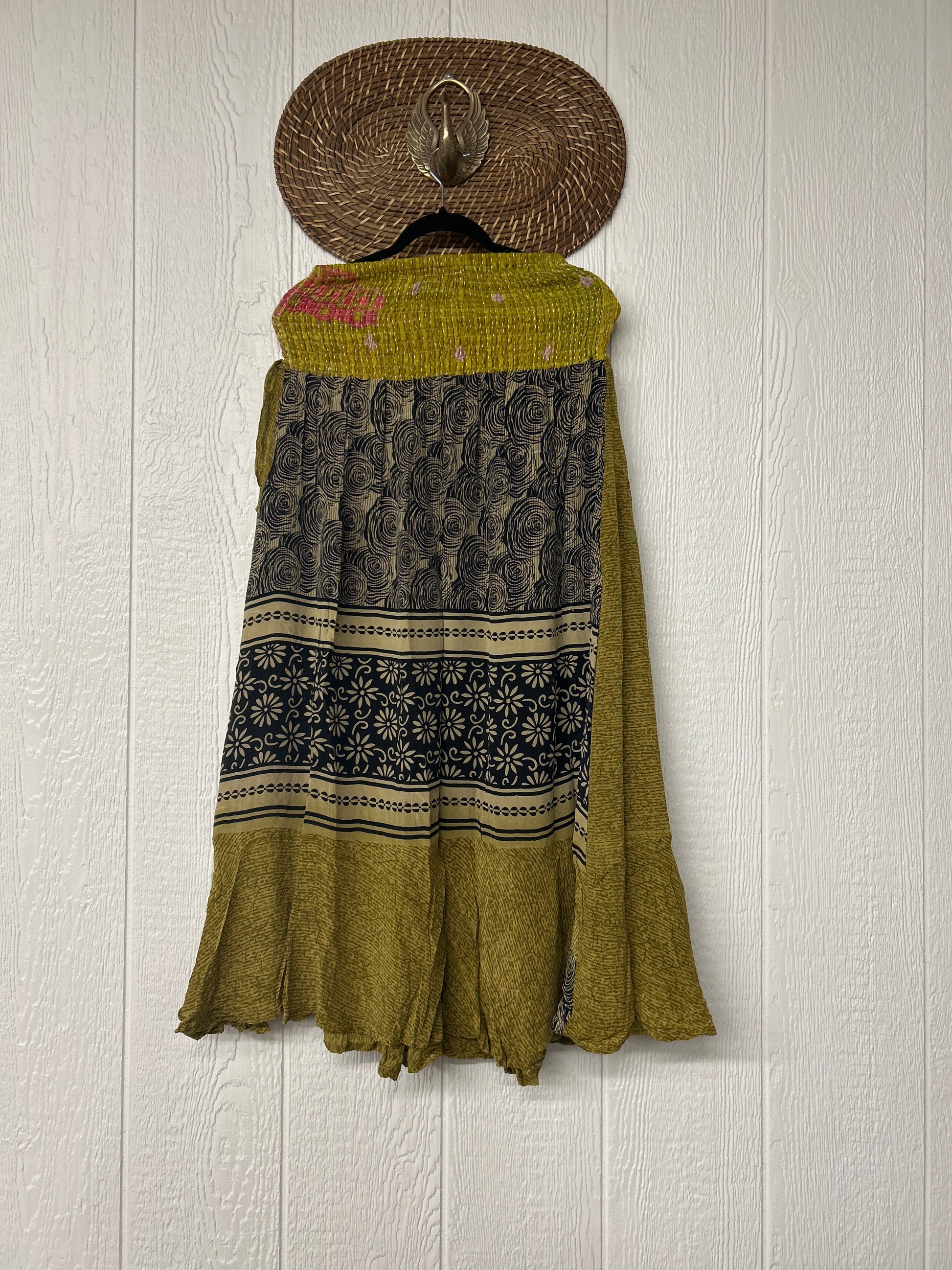 Crafted from vintage crepe sari this ethereal piece features a curved front wrap panel tacked on to the stretchy kantha waistband creating a flirty silhouette fit for a rockstar.