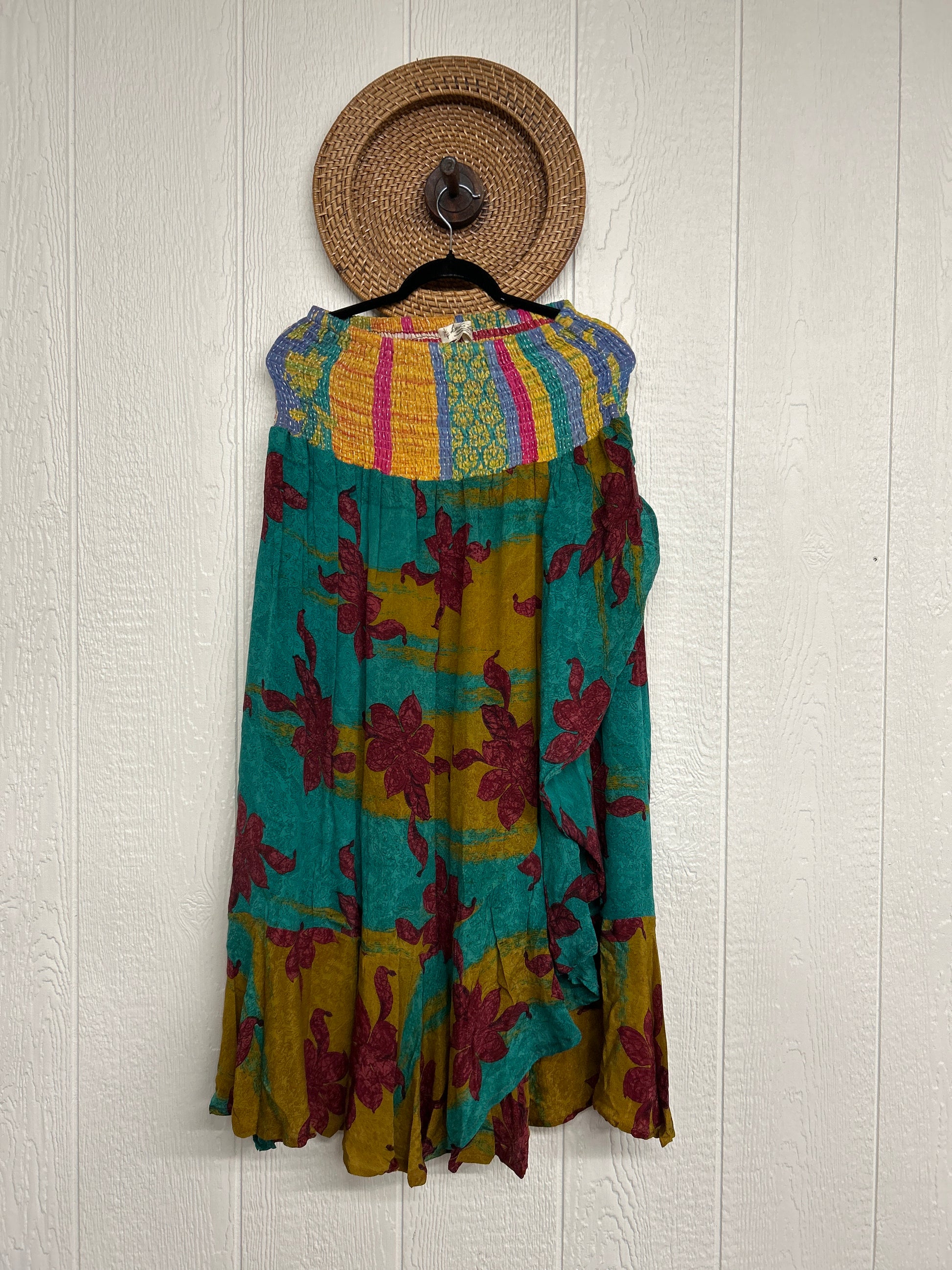 Crafted from vintage crepe sari this ethereal piece features a curved front wrap panel tacked on to the stretchy kantha waistband creating a flirty silhouette fit for a rockstar.