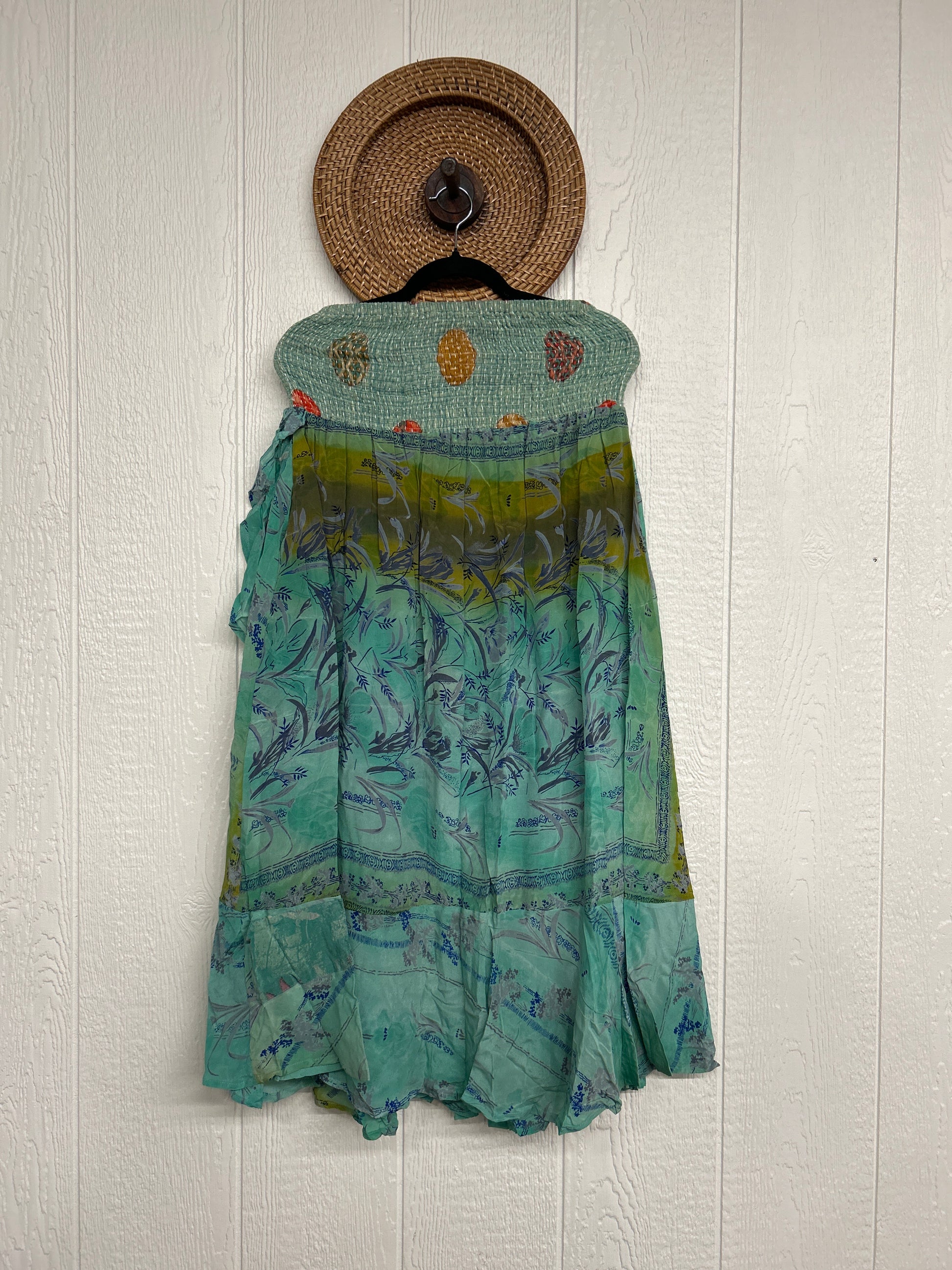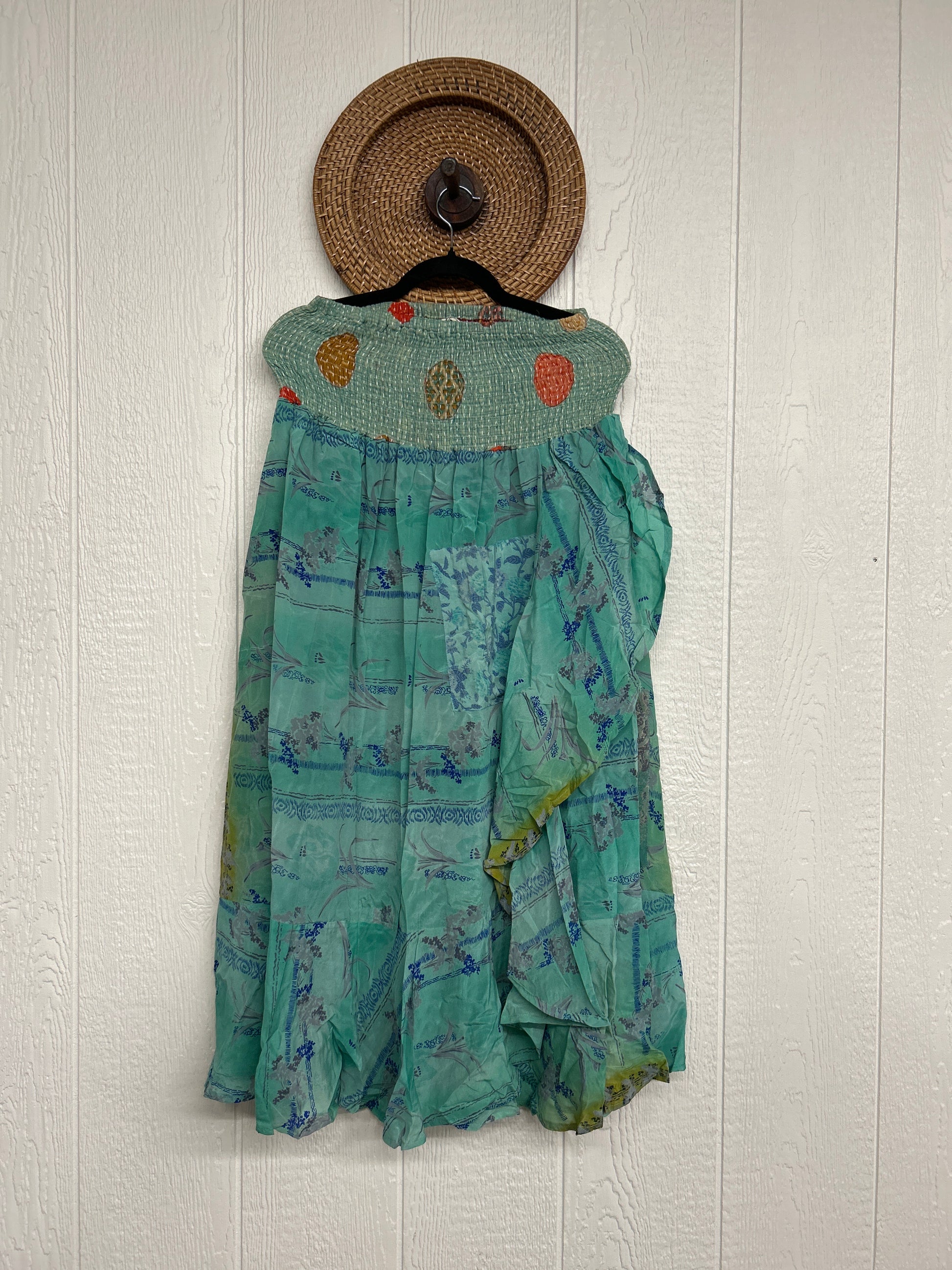 Crafted from vintage crepe sari this ethereal piece features a curved front wrap panel tacked on to the stretchy kantha waistband creating a flirty silhouette fit for a rockstar.