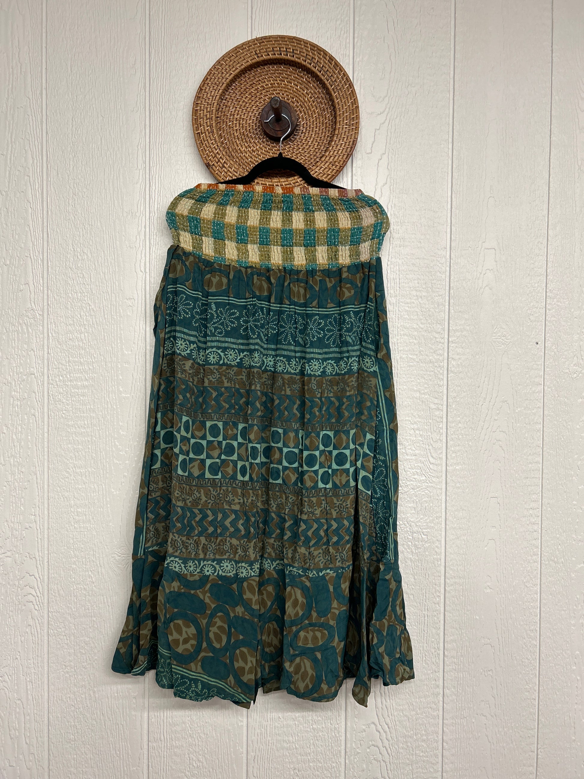 Crafted from vintage crepe sari this ethereal piece features a curved front wrap panel tacked on to the stretchy kantha waistband creating a flirty silhouette fit for a rockstar.