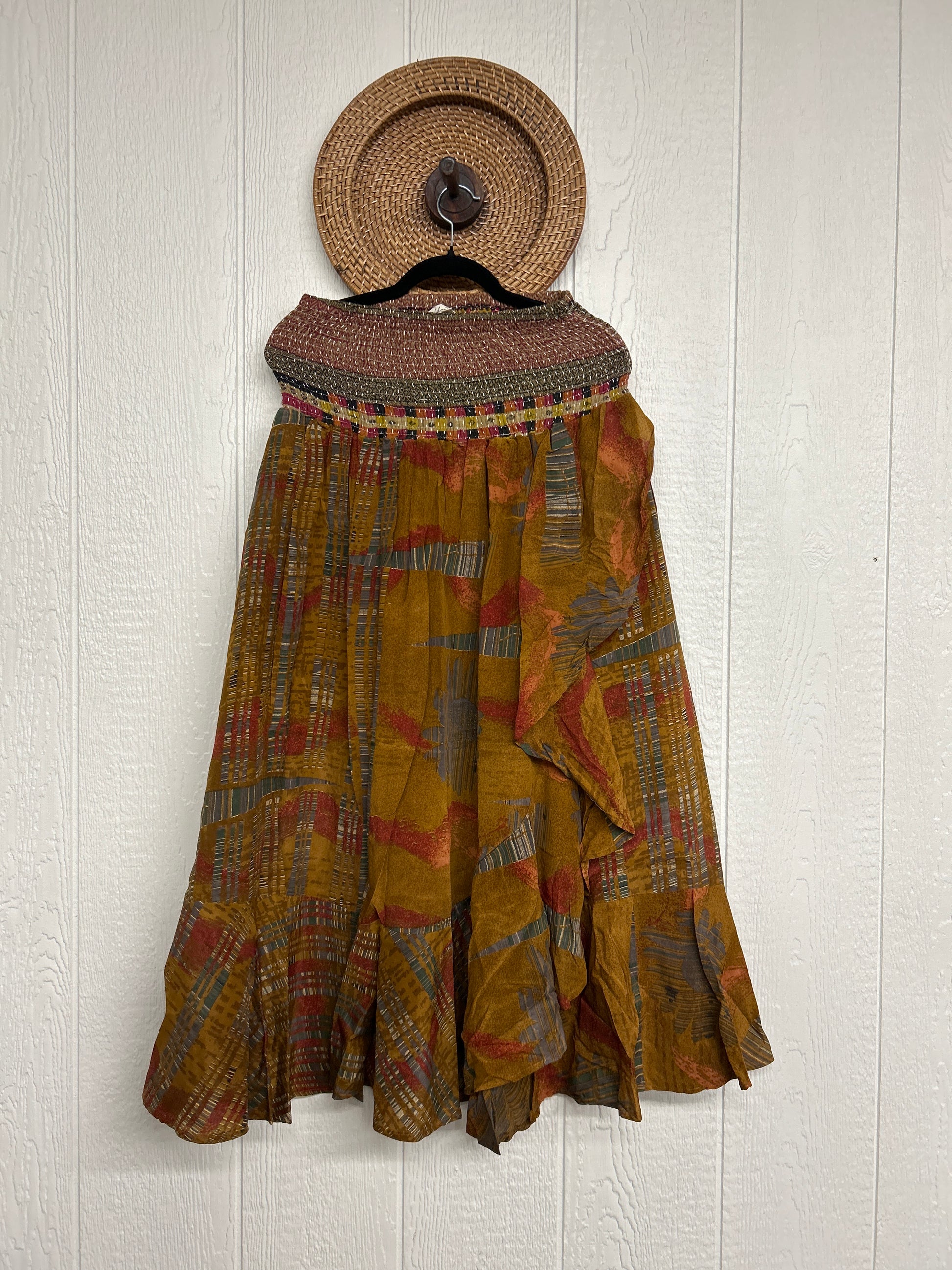 Crafted from vintage crepe sari this ethereal piece features a curved front wrap panel tacked on to the stretchy kantha waistband creating a flirty silhouette fit for a rockstar.