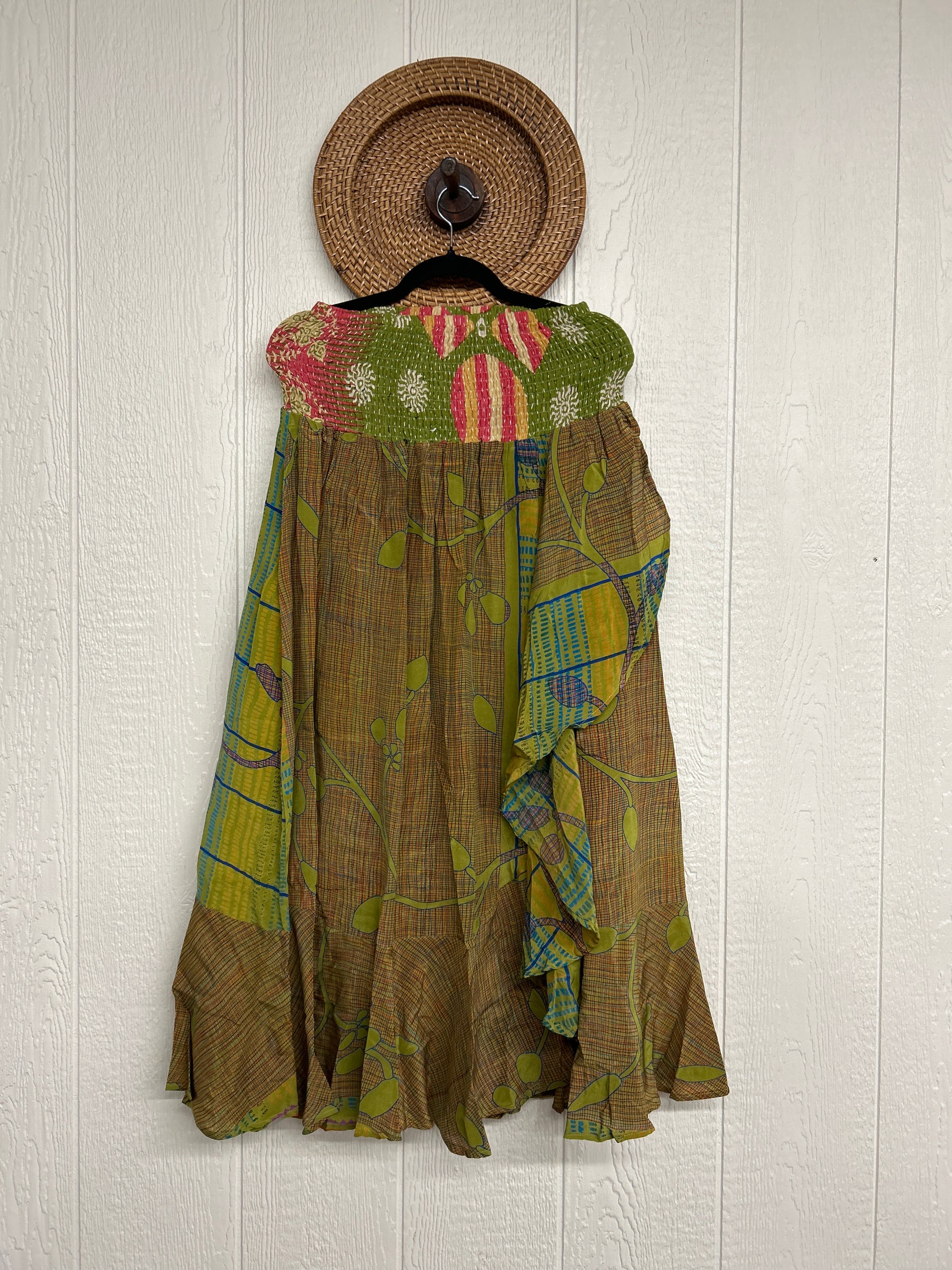 Crafted from vintage crepe sari this ethereal piece features a curved front wrap panel tacked on to the stretchy kantha waistband creating a flirty silhouette fit for a rockstar.