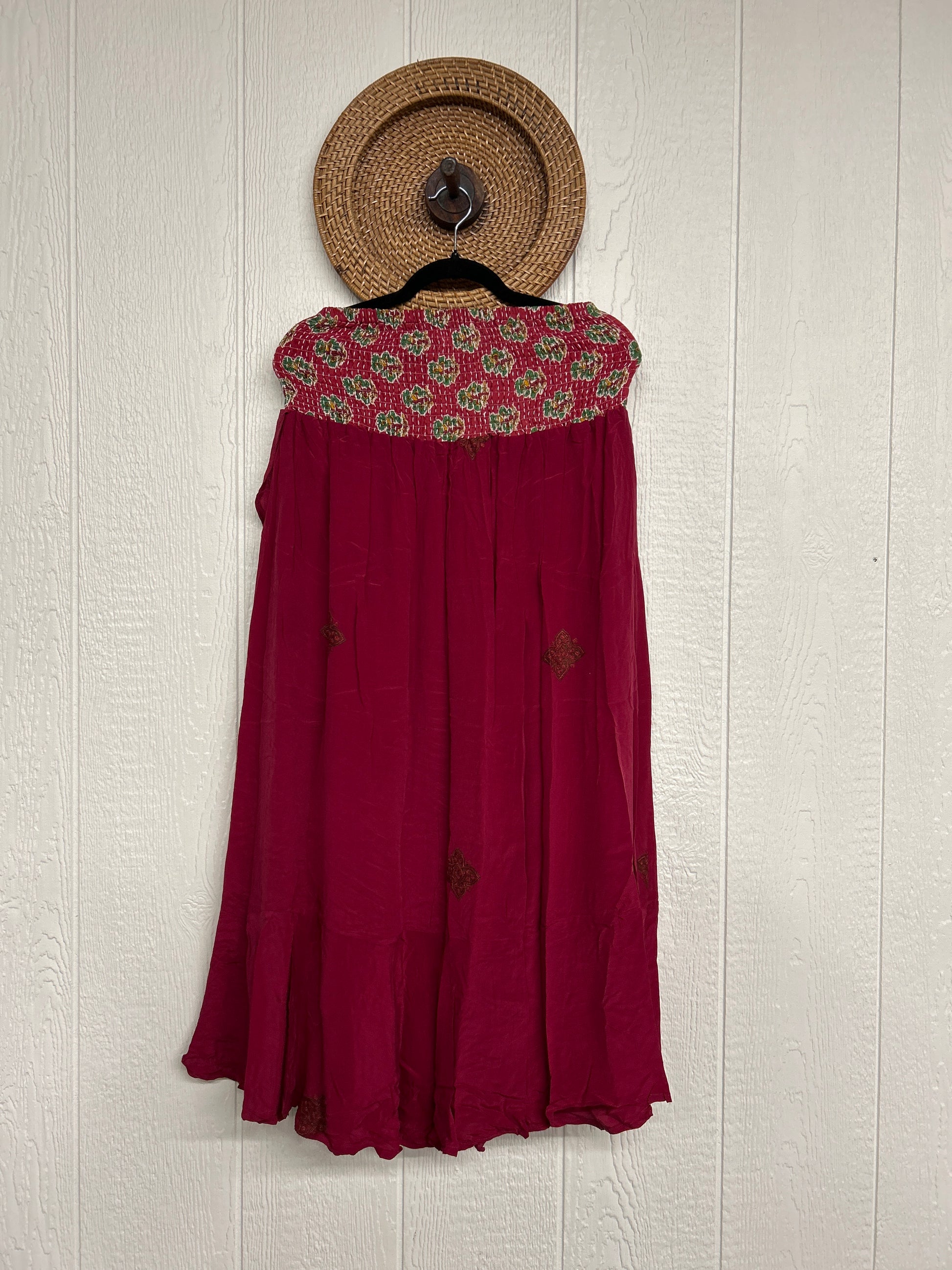 Crafted from vintage crepe sari this ethereal piece features a curved front wrap panel tacked on to the stretchy kantha waistband creating a flirty silhouette fit for a rockstar.