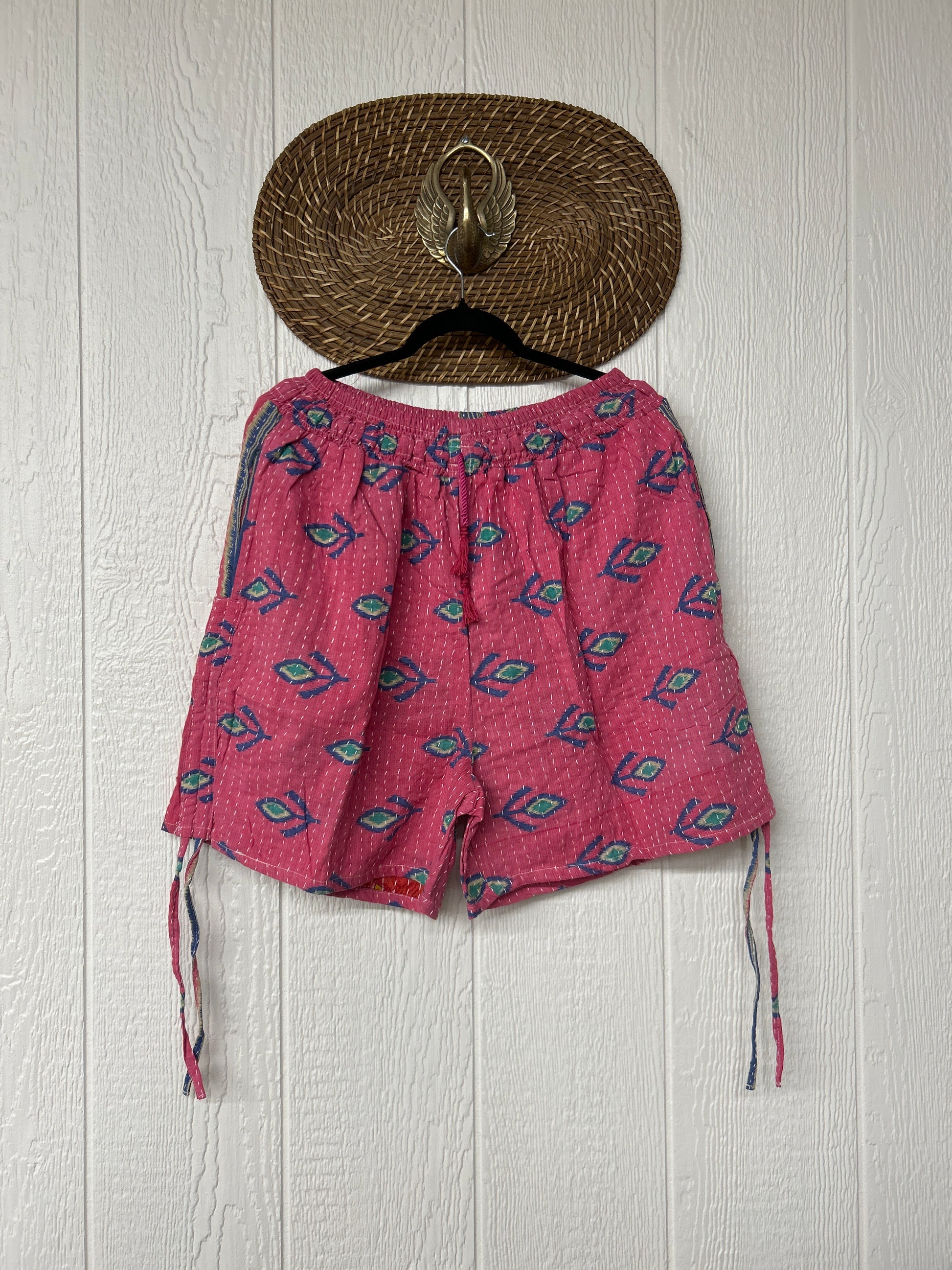 Crafted from our ultra lux vintage cotton Kantha stitched sari. Features interior pockets, a smocked waistband that is soft against the skin with an adjustable drawstring. This fully customizable piece also has a cinch drawstring on the outer leg so you can make the shorts longer or shorter. We are obsessed!