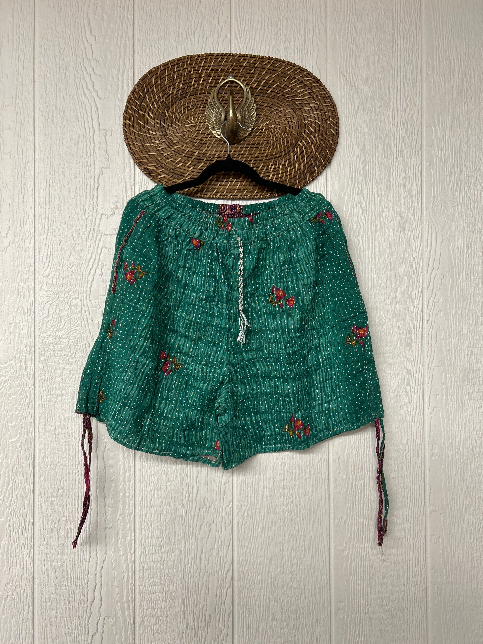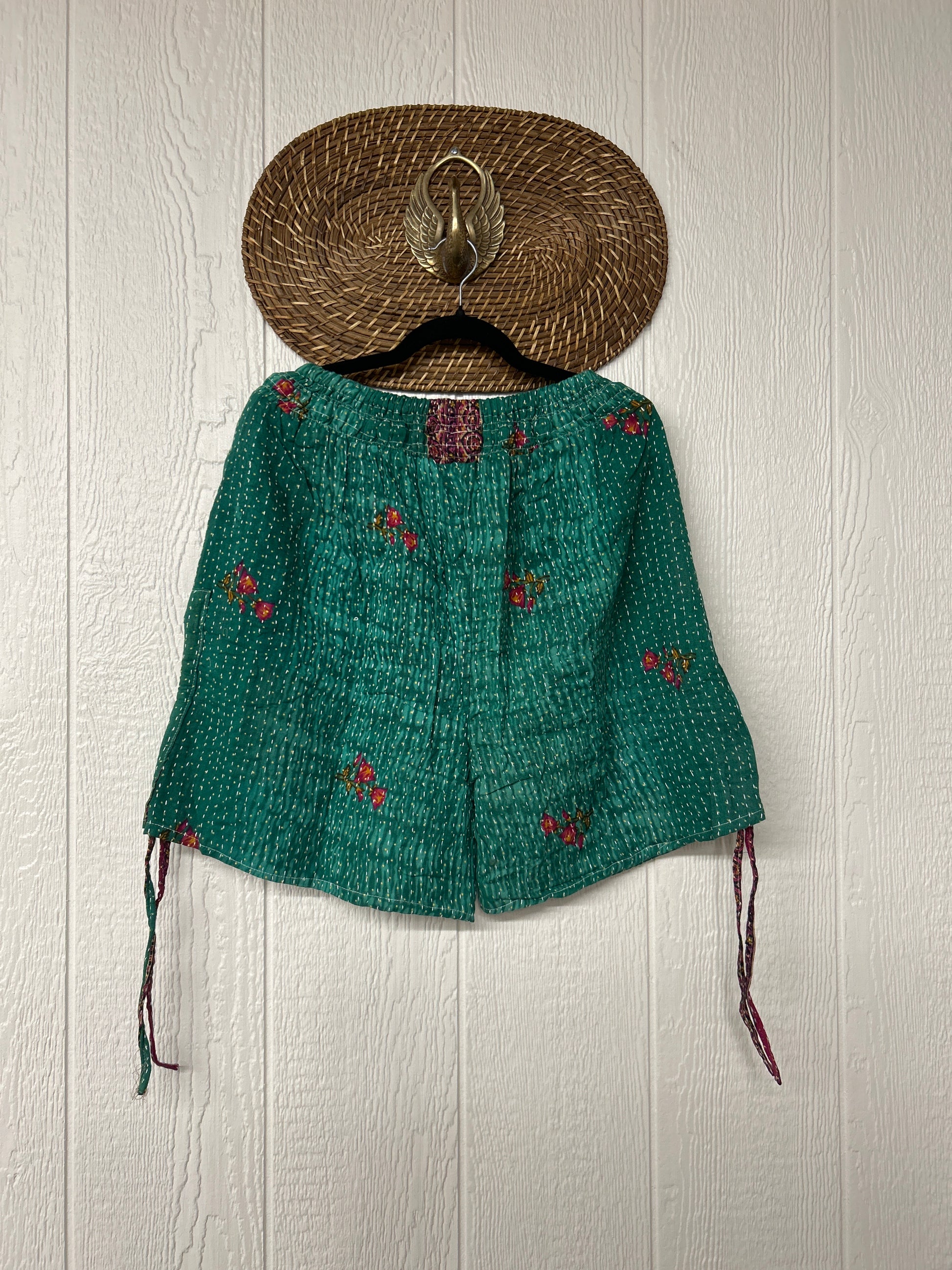 Crafted from our ultra lux vintage cotton Kantha stitched sari. Features interior pockets, a smocked waistband that is soft against the skin with an adjustable drawstring. This fully customizable piece also has a cinch drawstring on the outer leg so you can make the shorts longer or shorter. We are obsessed!
