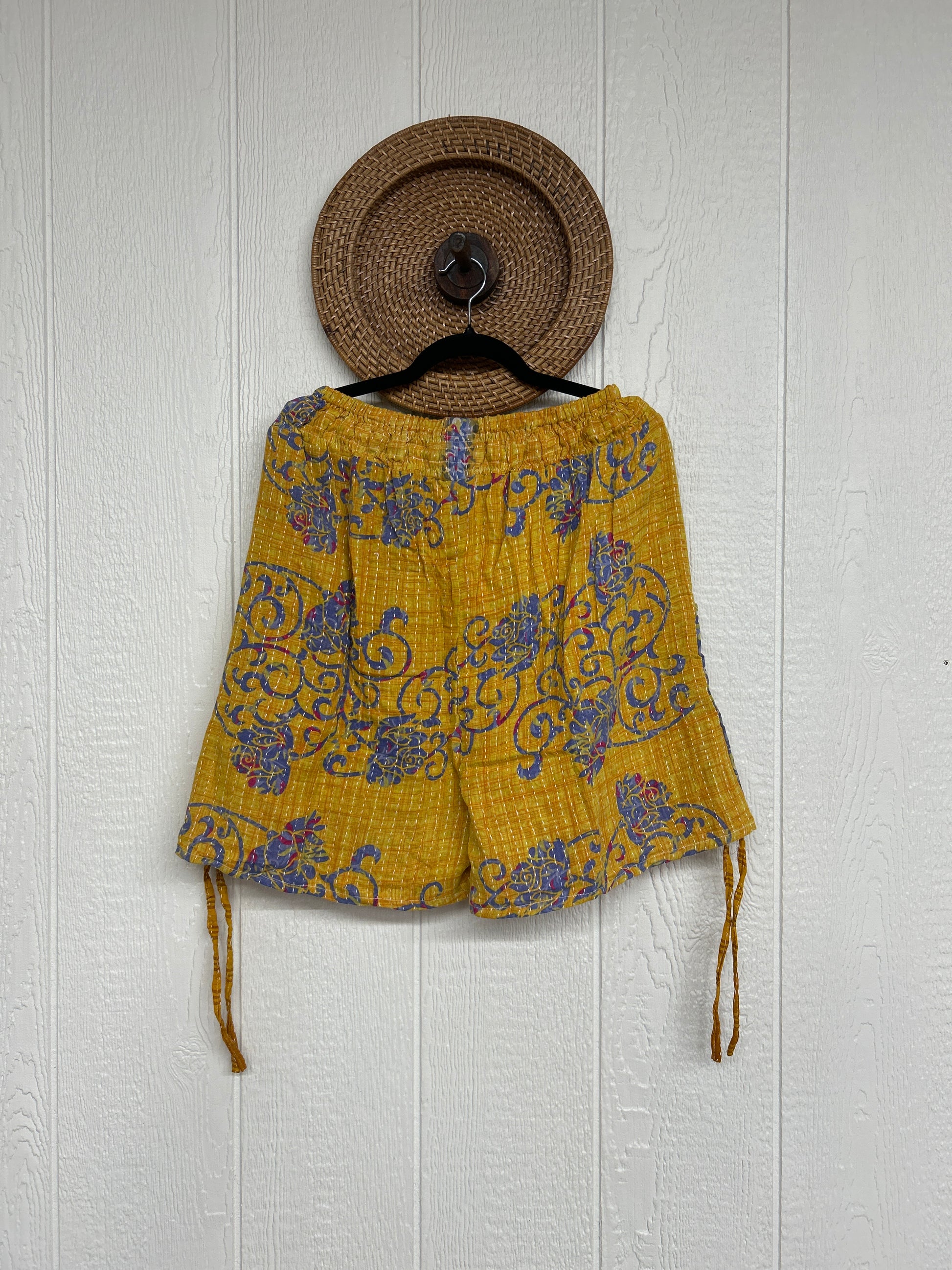 Crafted from our ultra lux vintage cotton Kantha stitched sari. Features interior pockets, a smocked waistband that is soft against the skin with an adjustable drawstring. This fully customizable piece also has a cinch drawstring on the outer leg so you can make the shorts longer or shorter. We are obsessed!