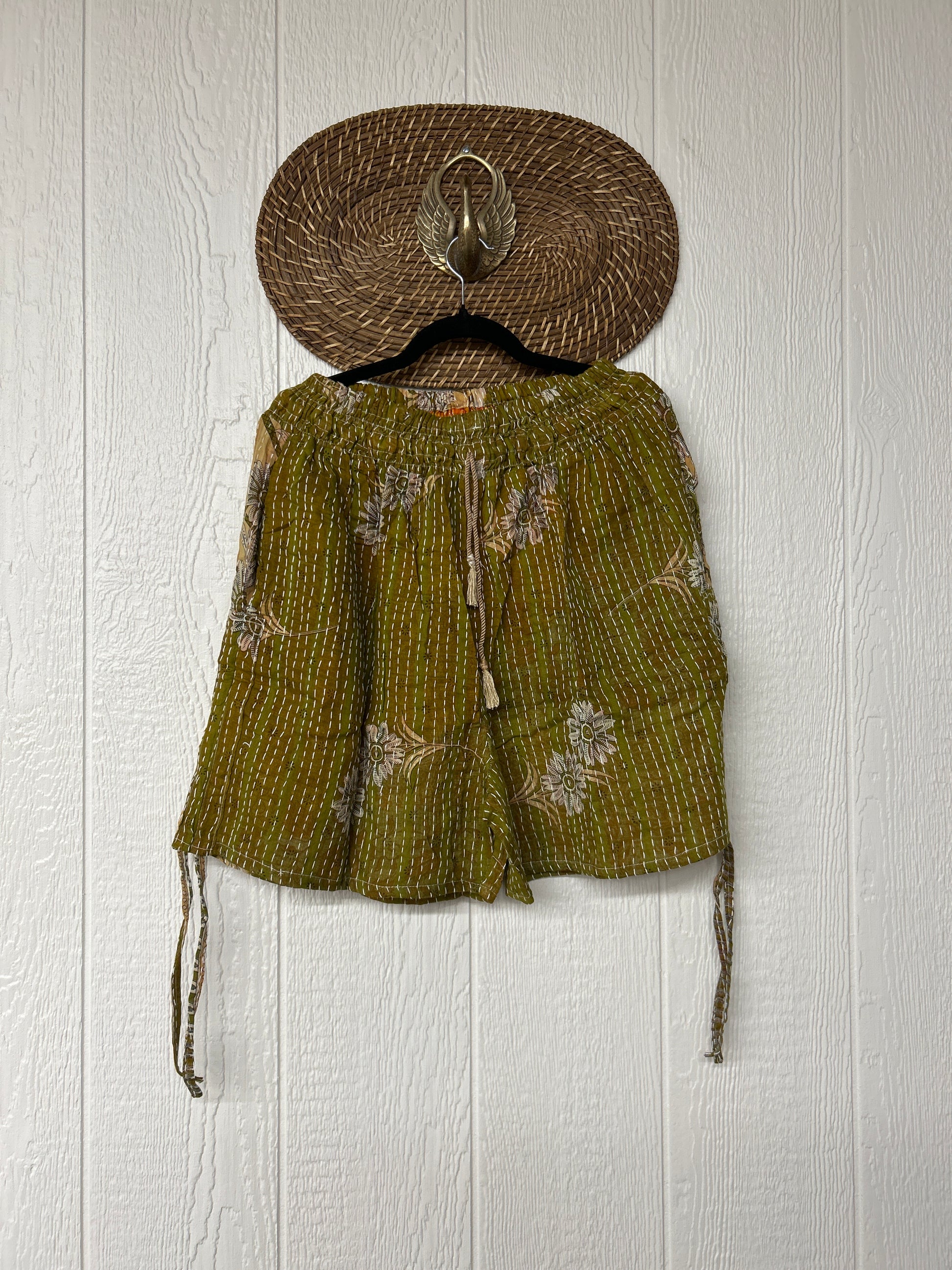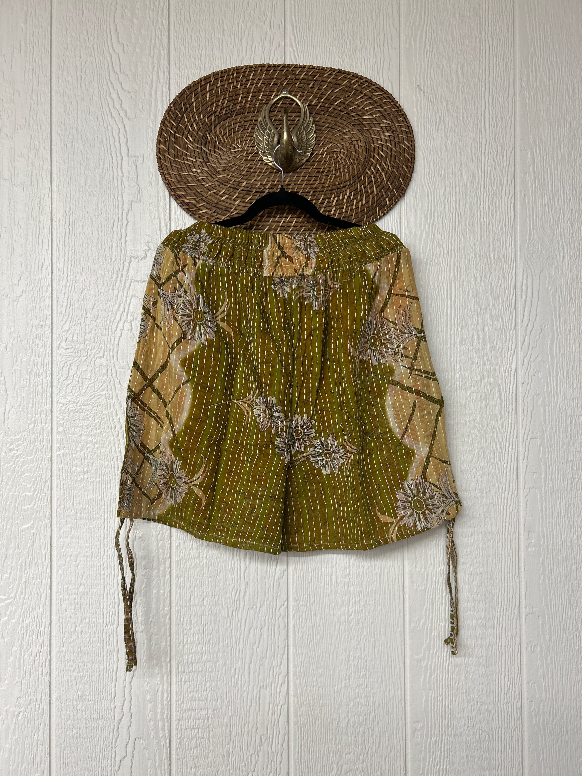 Crafted from our ultra lux vintage cotton Kantha stitched sari. Features interior pockets, a smocked waistband that is soft against the skin with an adjustable drawstring. This fully customizable piece also has a cinch drawstring on the outer leg so you can make the shorts longer or shorter. We are obsessed!