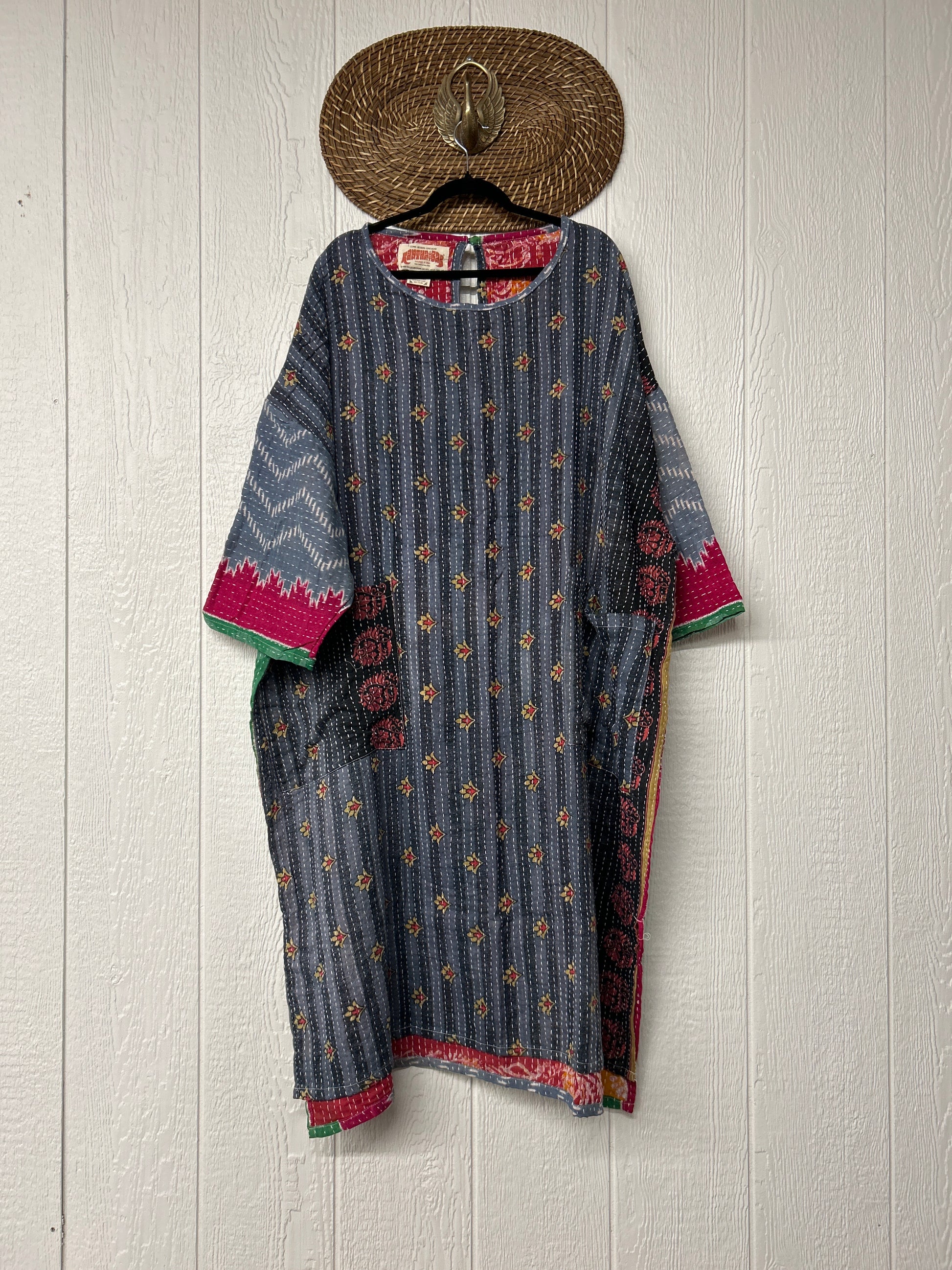 Features slouchy pockets, a scoop neckline, high low hem with side slits for extra dimension. The Kantha Dream Pullover Maxi is fully reversible giving you two maxi dresses in one. We know it will be your new go to.