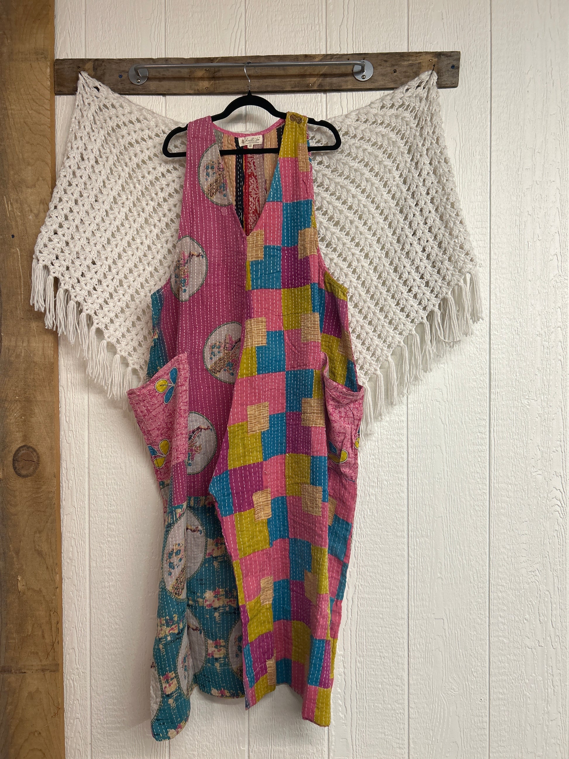 Our jumpsuit is made from our vintage kantha embroidered sari.