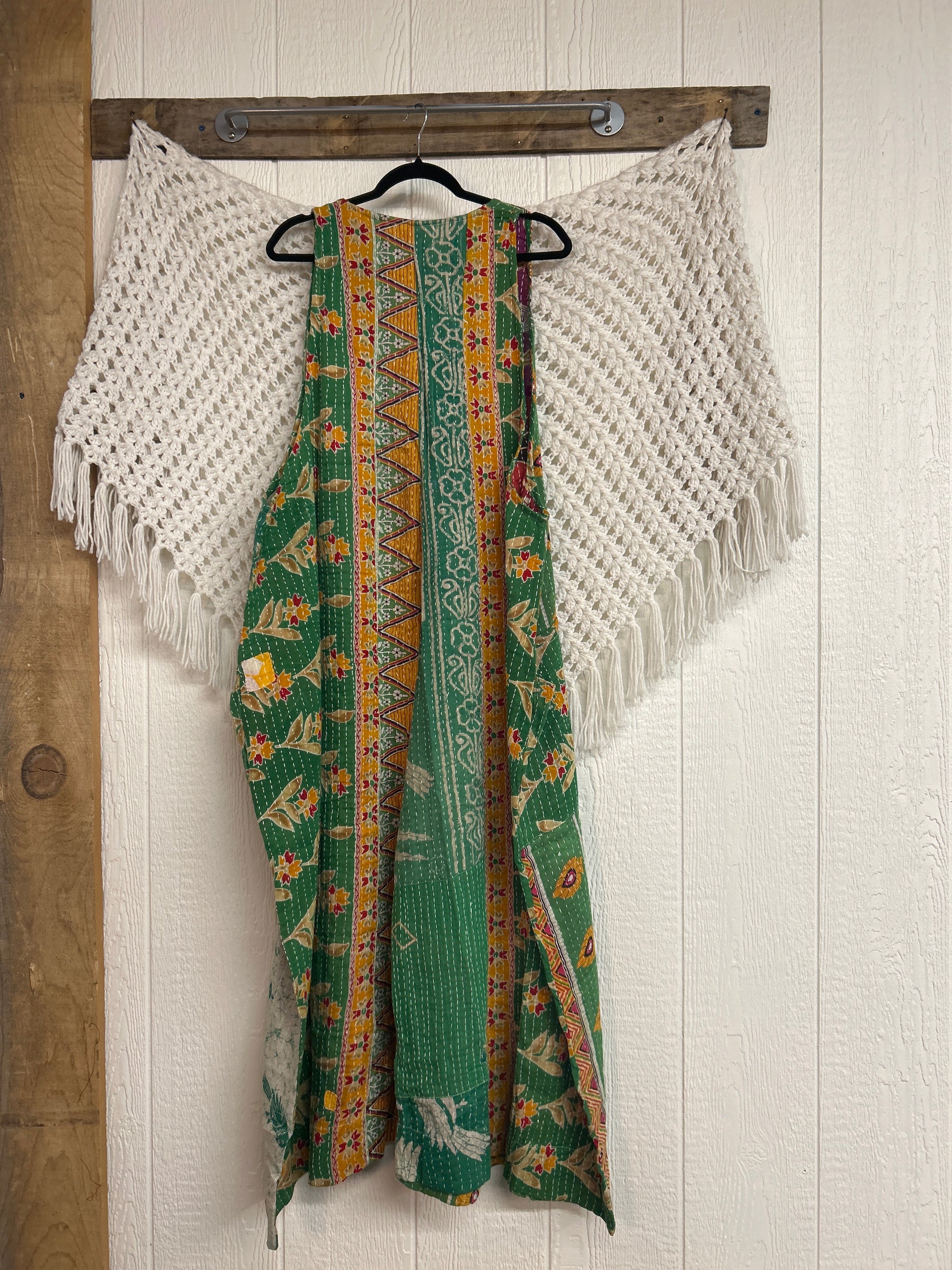 Our jumpsuit is made from our vintage kantha embroidered sari.