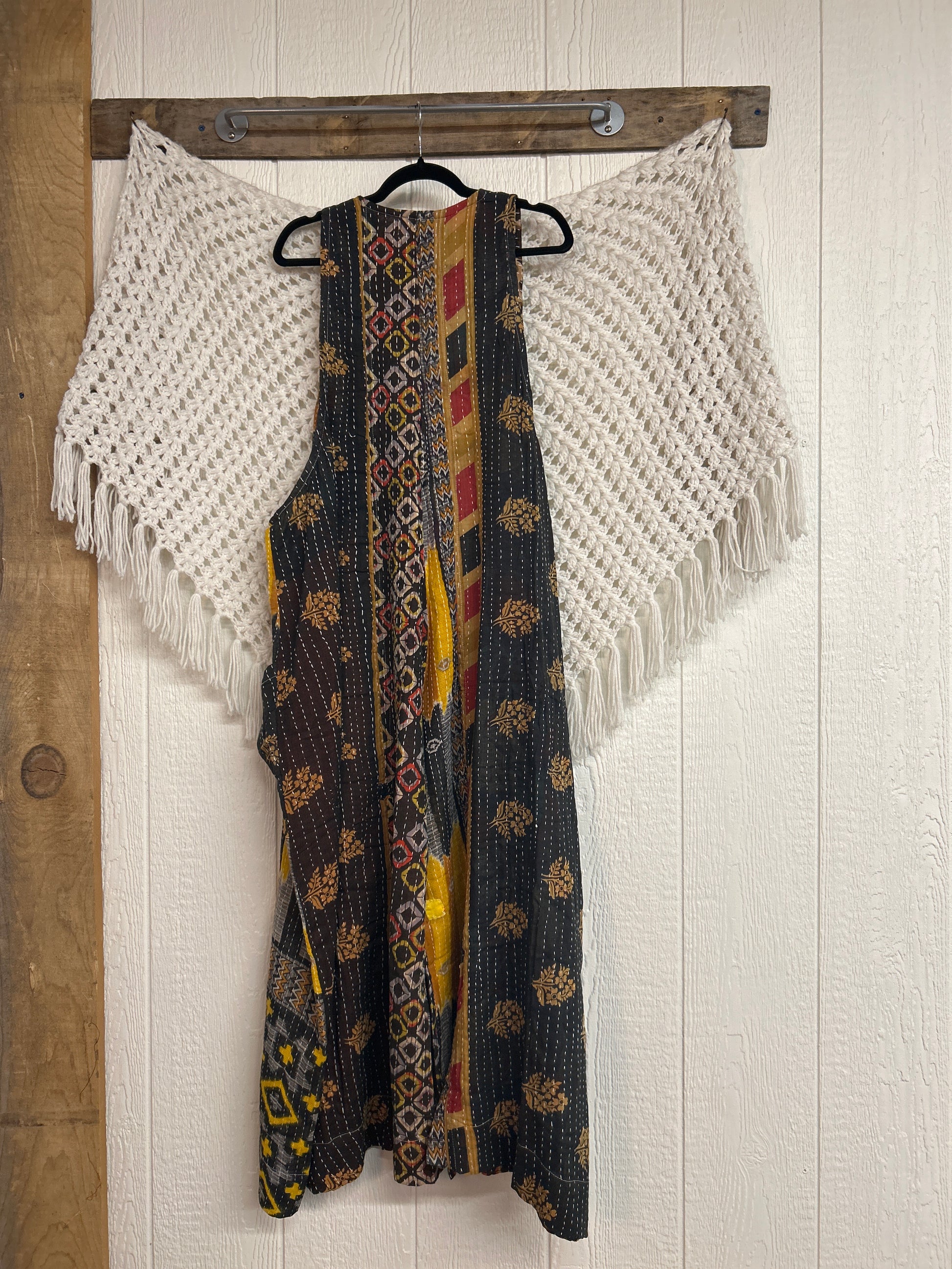 Our jumpsuit is made from our vintage kantha embroidered sari.