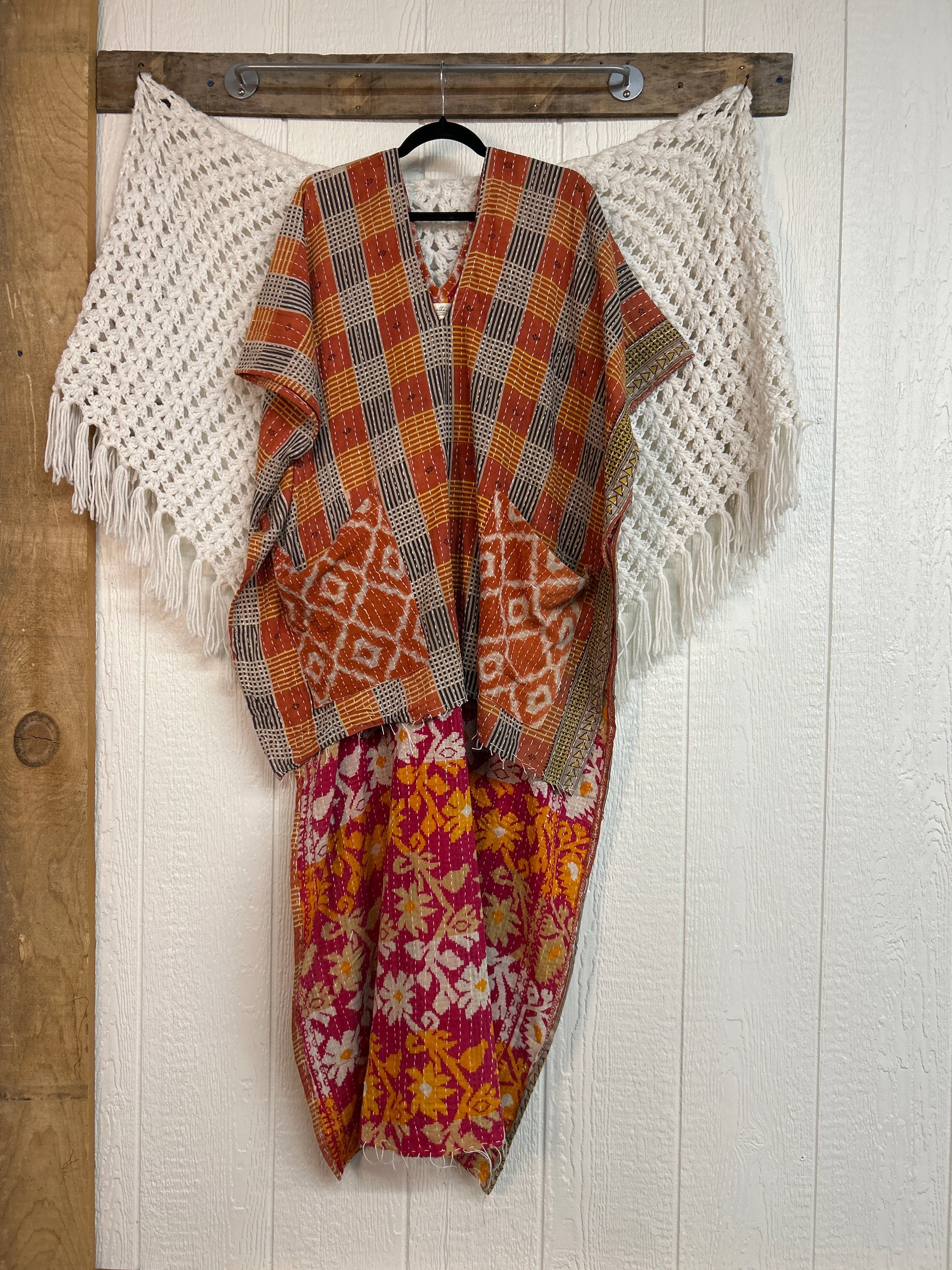 The Kantha Hi/Lo Tunic is a reversible, free-size, throw-on-and-go fashion must have! It features a gorgeous deep V-neck and long trailing back. Styles beautifully with your favorite vintage shorts, leggings, or bells.