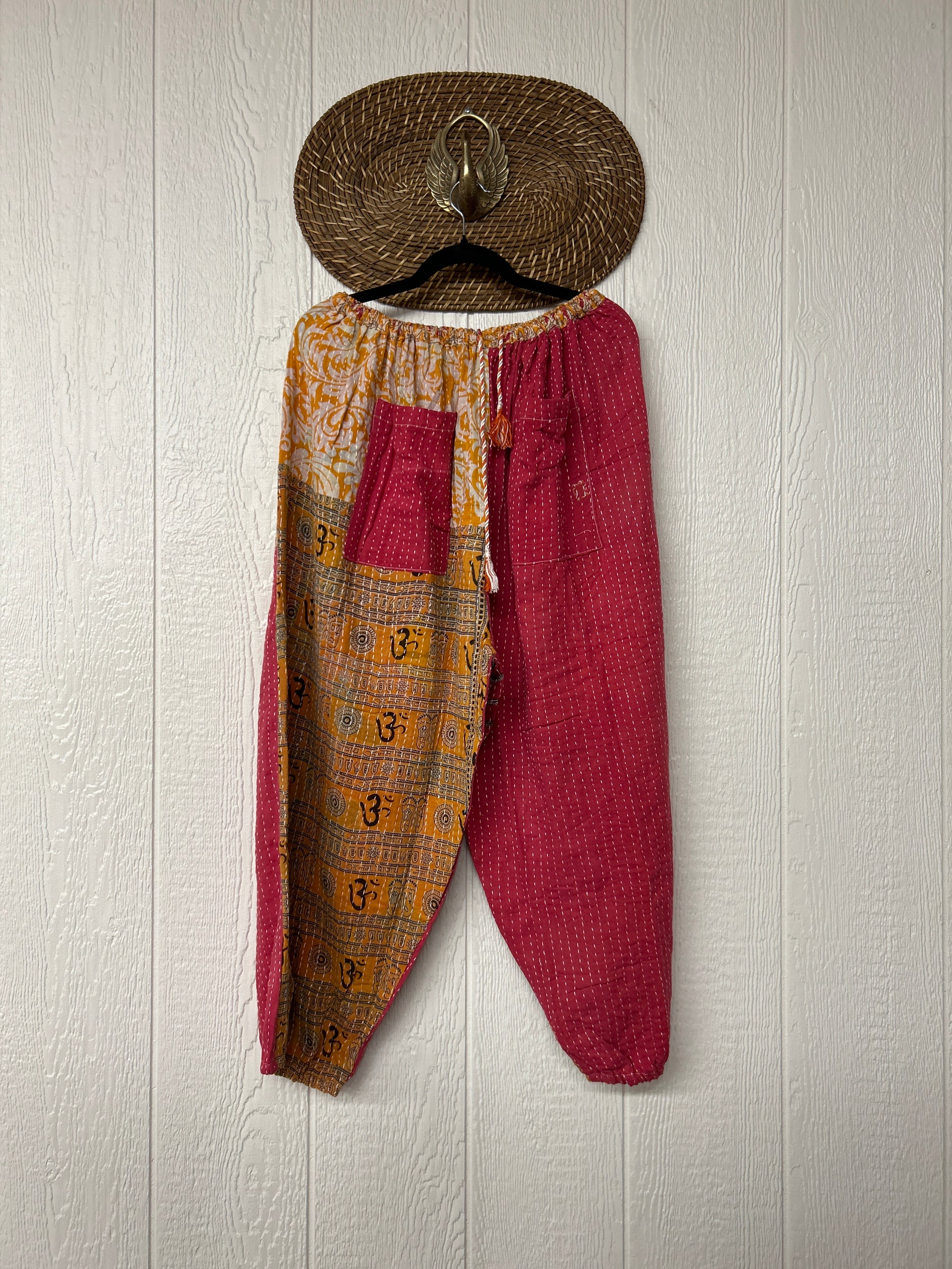 Crafted from luxe vintage kantha stitched cotton sari these chic kantha joggers feature two slouchy big exterior pockets and a thin elastic jogger opening at the leg . The waistband is magic and elastic featuring a drawstring for ultimate versatility.