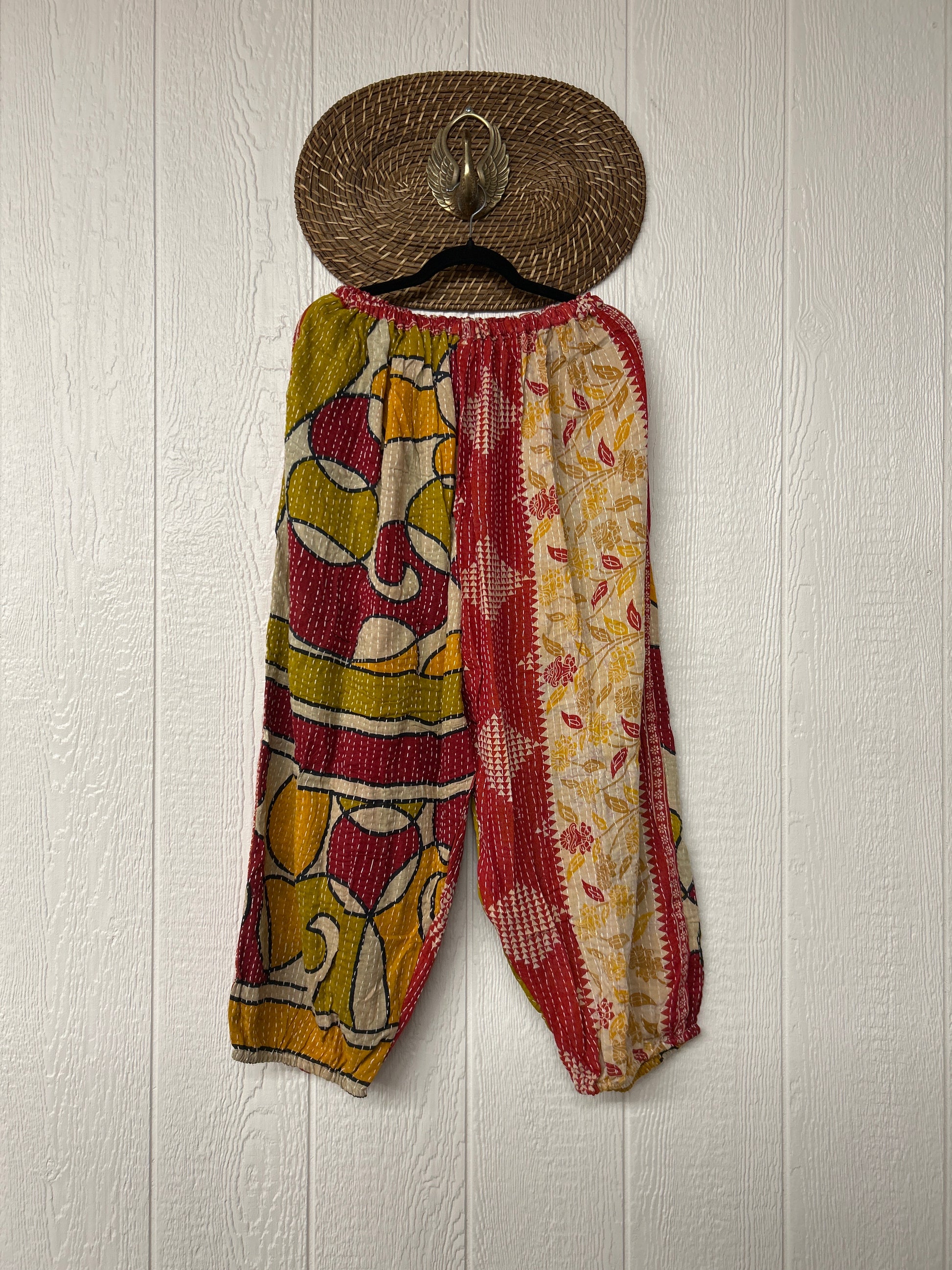 Crafted from luxe vintage kantha stitched cotton sari these chic kantha joggers feature two slouchy big exterior pockets and a thin elastic jogger opening at the leg . The waistband is magic and elastic featuring a drawstring for ultimate versatility.