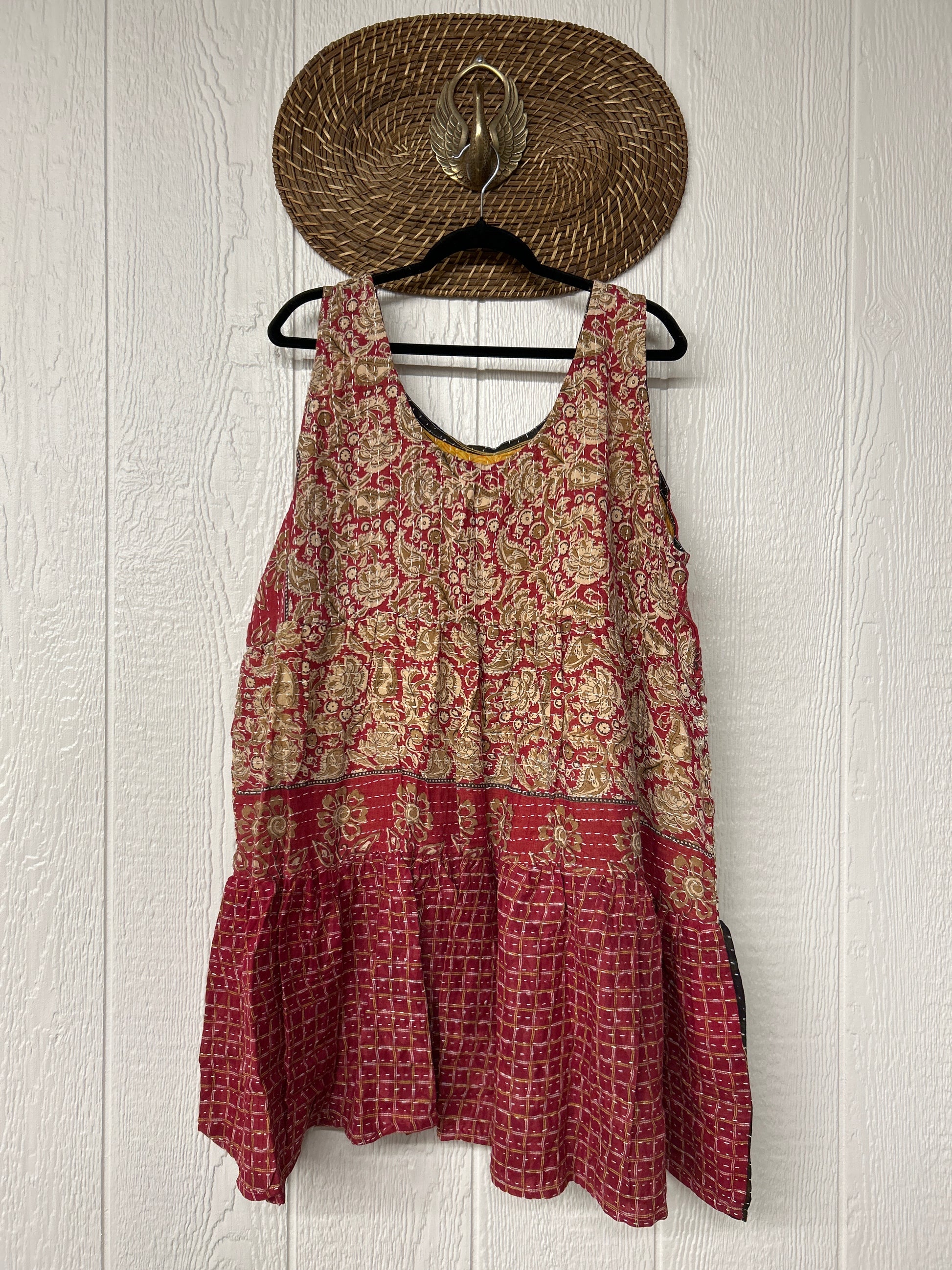 This sweet silhouette is crafted from our ultra lux Kantha stitched cotton sari. The Kantha Meadow Mini Dress features a button closure on the strap, deep interior front pockets, and a tiered bodice for extra twirling dimension!