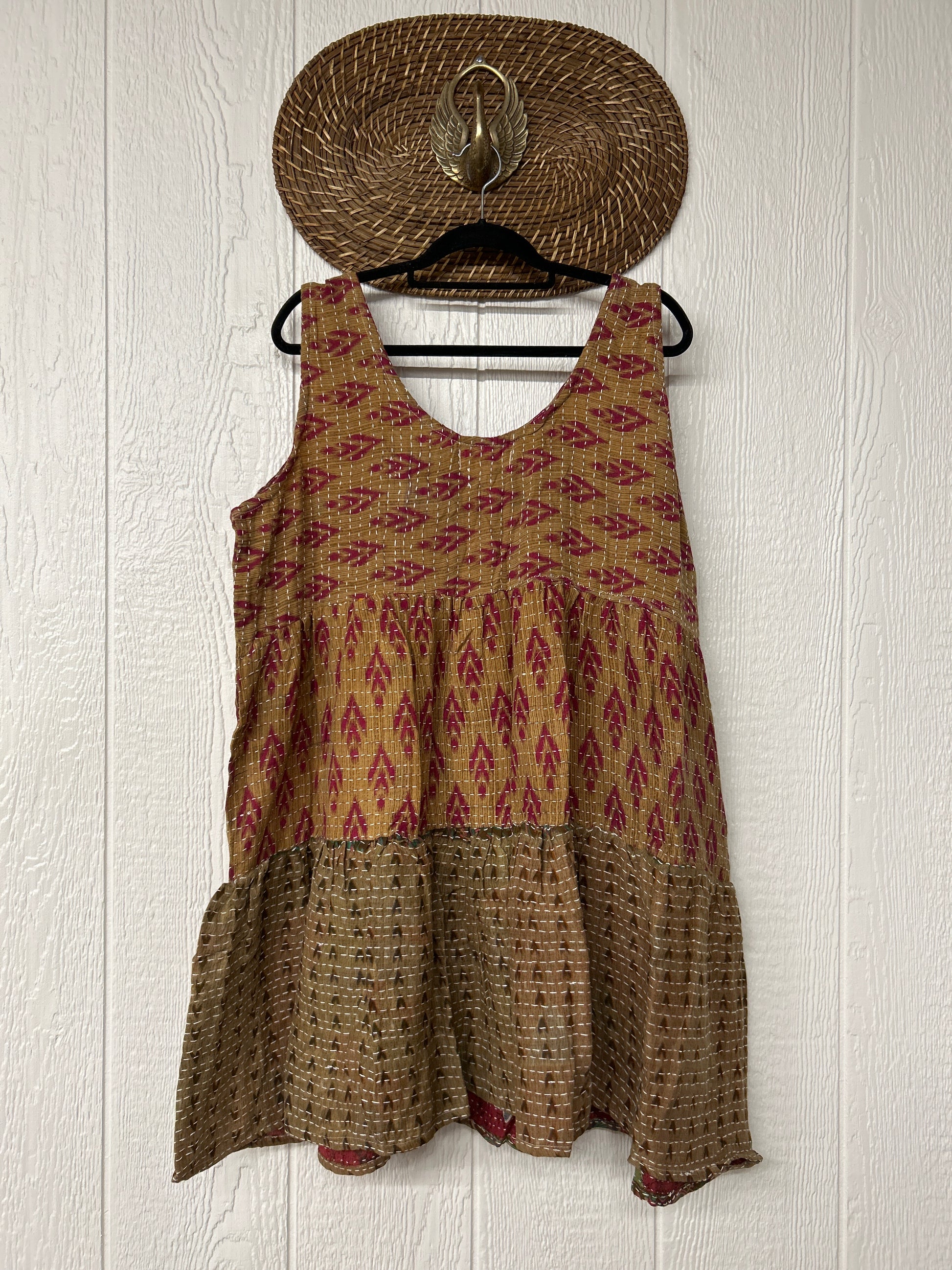 This sweet silhouette is crafted from our ultra lux Kantha stitched cotton sari. The Kantha Meadow Mini Dress features a button closure on the strap, deep interior front pockets, and a tiered bodice for extra twirling dimension!