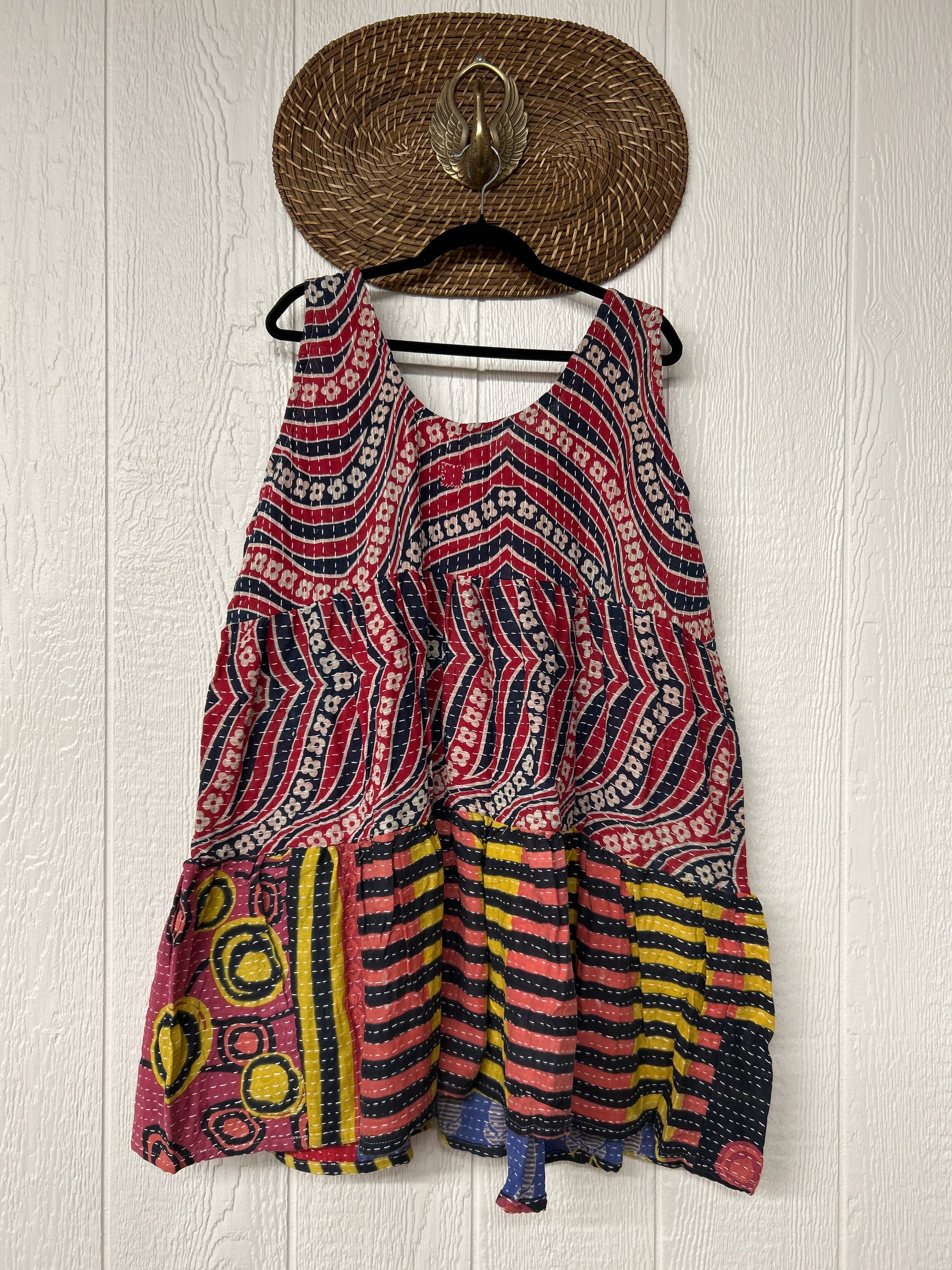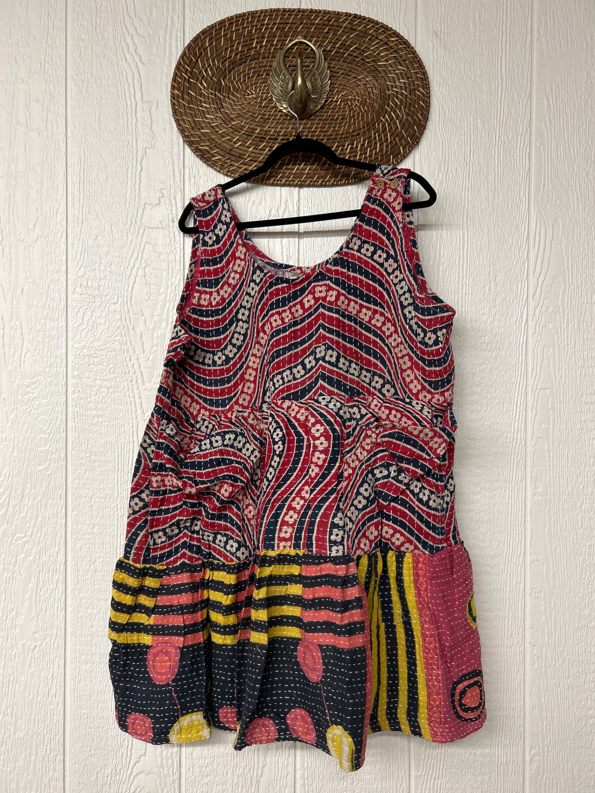 This sweet silhouette is crafted from our ultra lux Kantha stitched cotton sari. The Kantha Meadow Mini Dress features a button closure on the strap, deep interior front pockets, and a tiered bodice for extra twirling dimension!