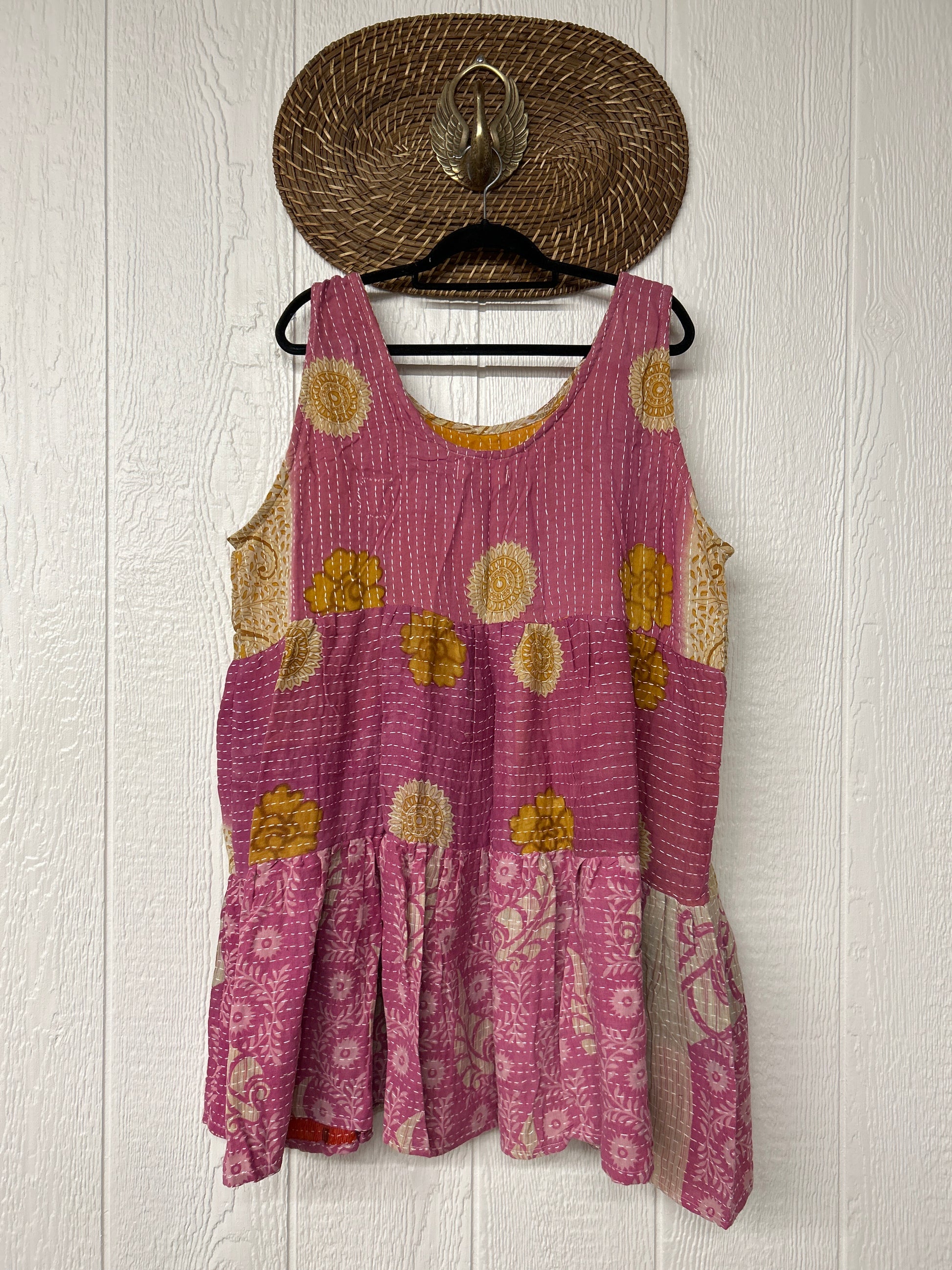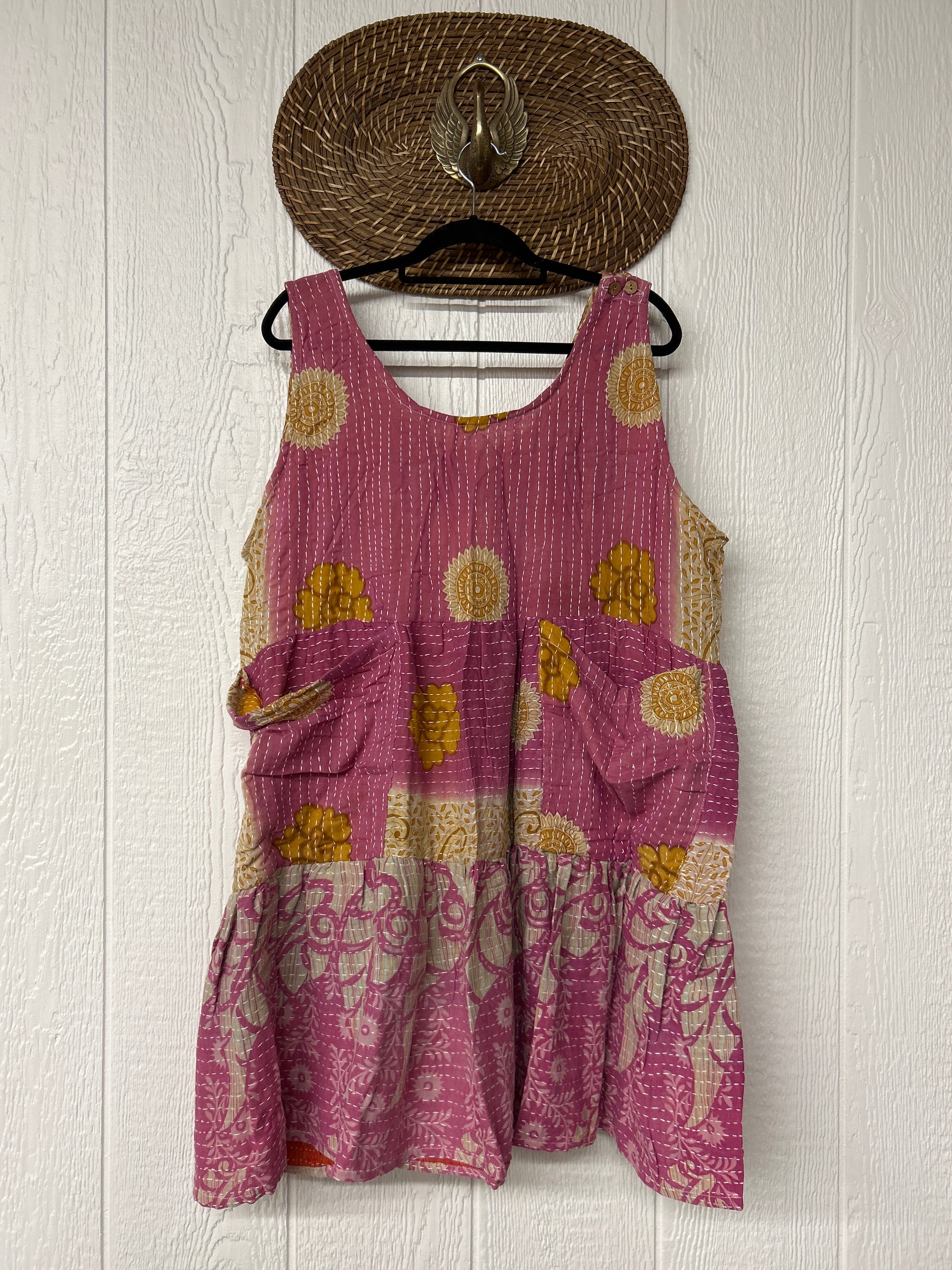 This sweet silhouette is crafted from our ultra lux Kantha stitched cotton sari. The Kantha Meadow Mini Dress features a button closure on the strap, deep interior front pockets, and a tiered bodice for extra twirling dimension!