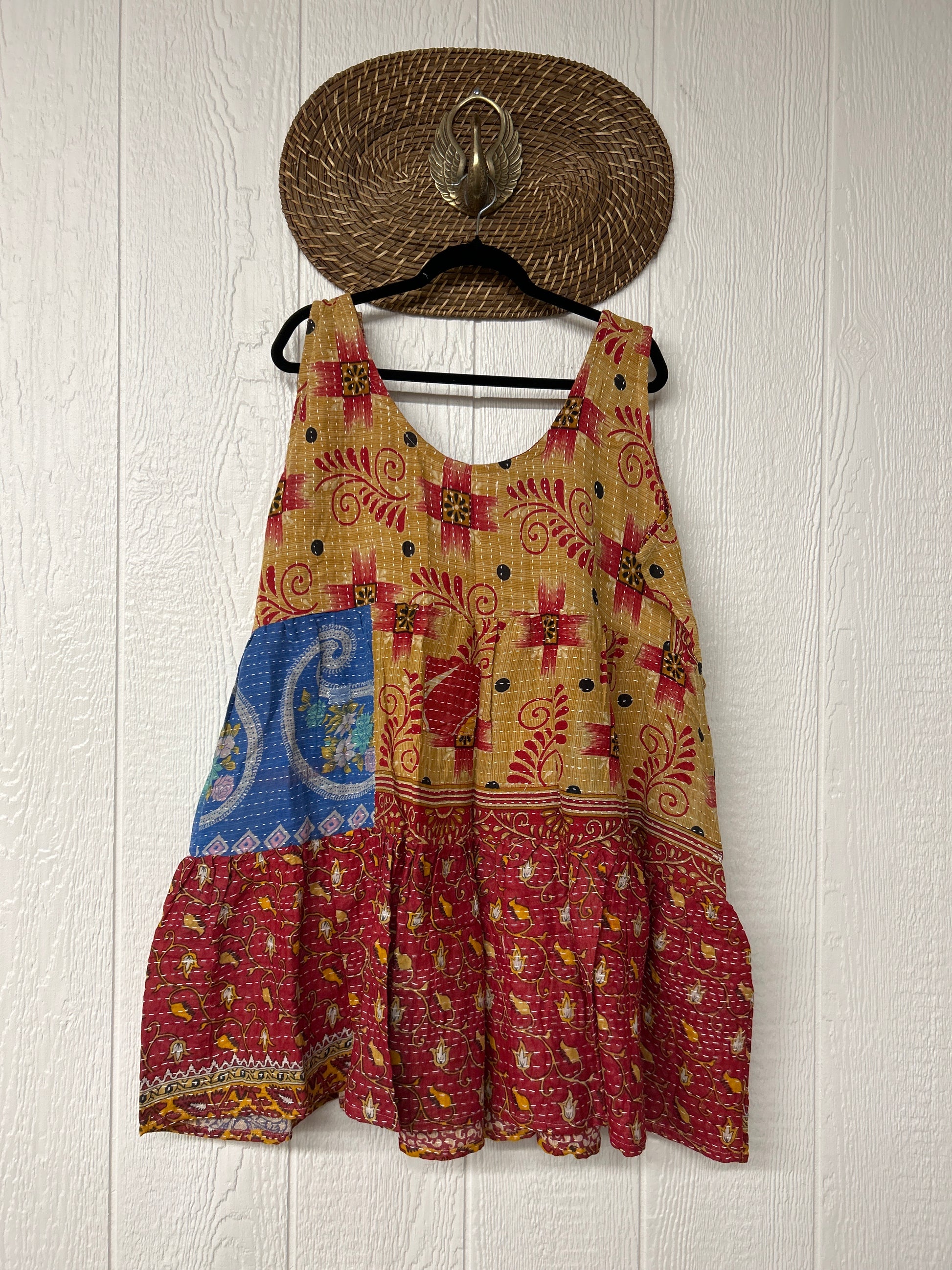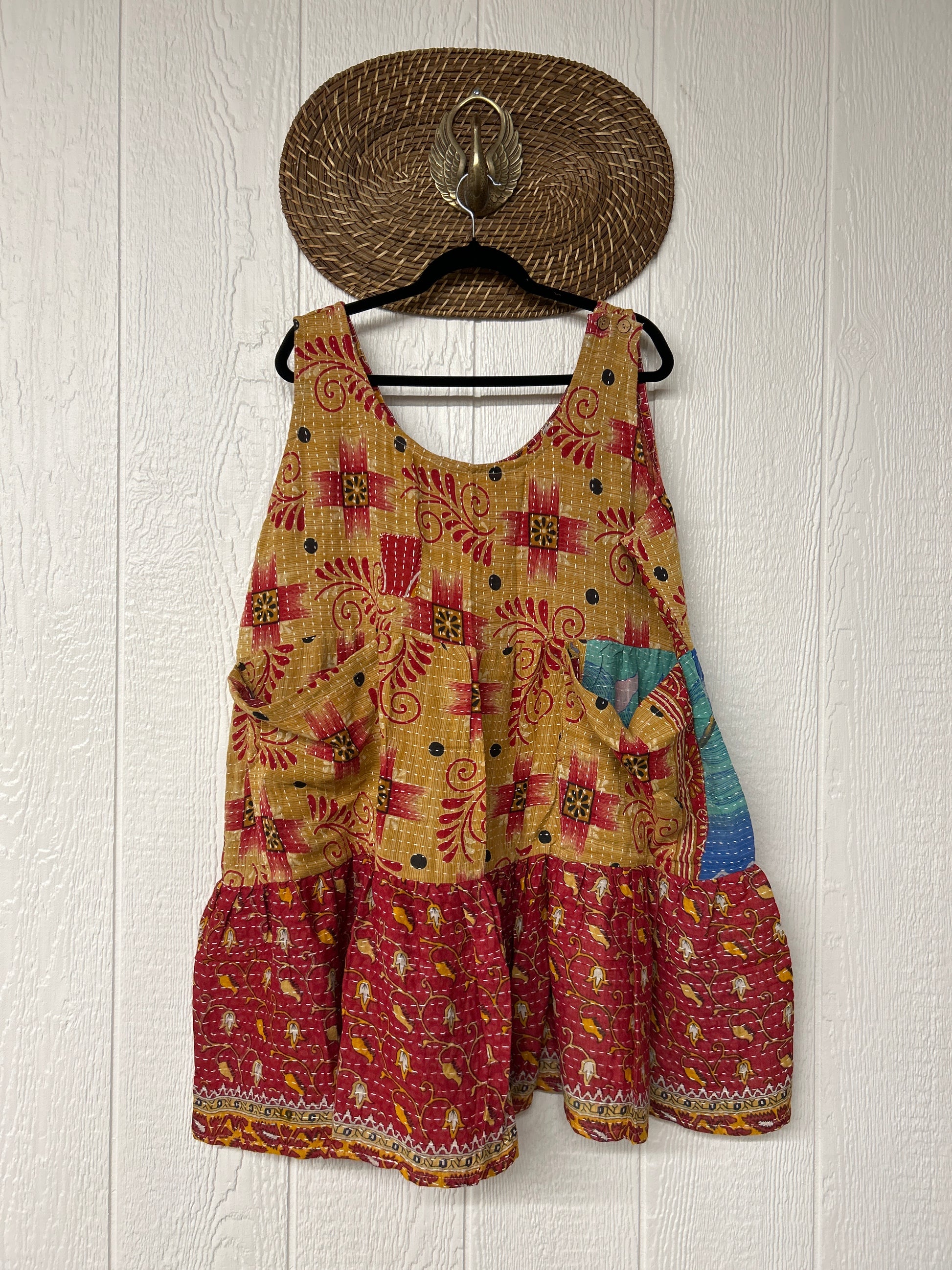 This sweet silhouette is crafted from our ultra lux Kantha stitched cotton sari. The Kantha Meadow Mini Dress features a button closure on the strap, deep interior front pockets, and a tiered bodice for extra twirling dimension!