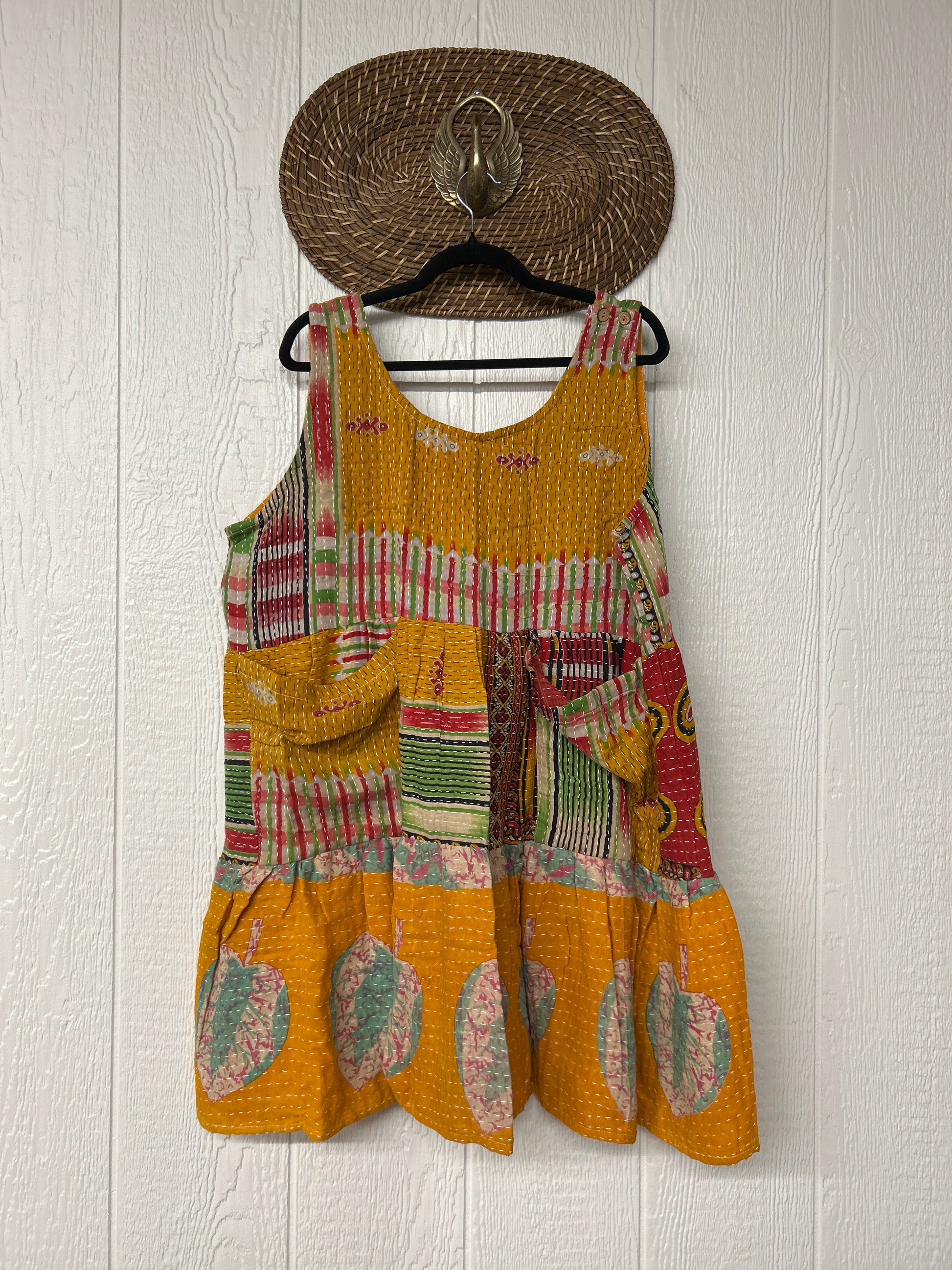 This sweet silhouette is crafted from our ultra lux Kantha stitched cotton sari. The Kantha Meadow Mini Dress features a button closure on the strap, deep interior front pockets, and a tiered bodice for extra twirling dimension!