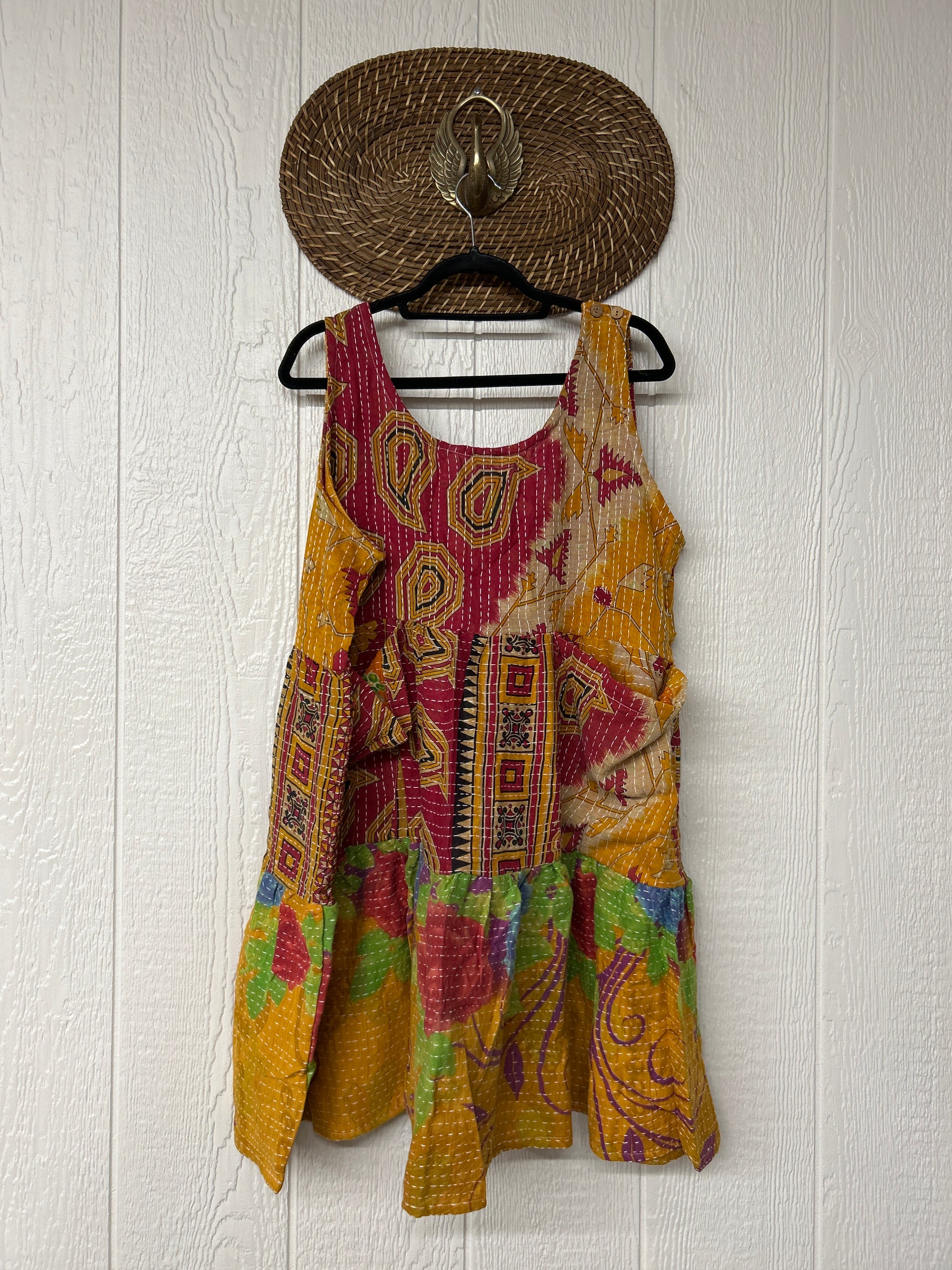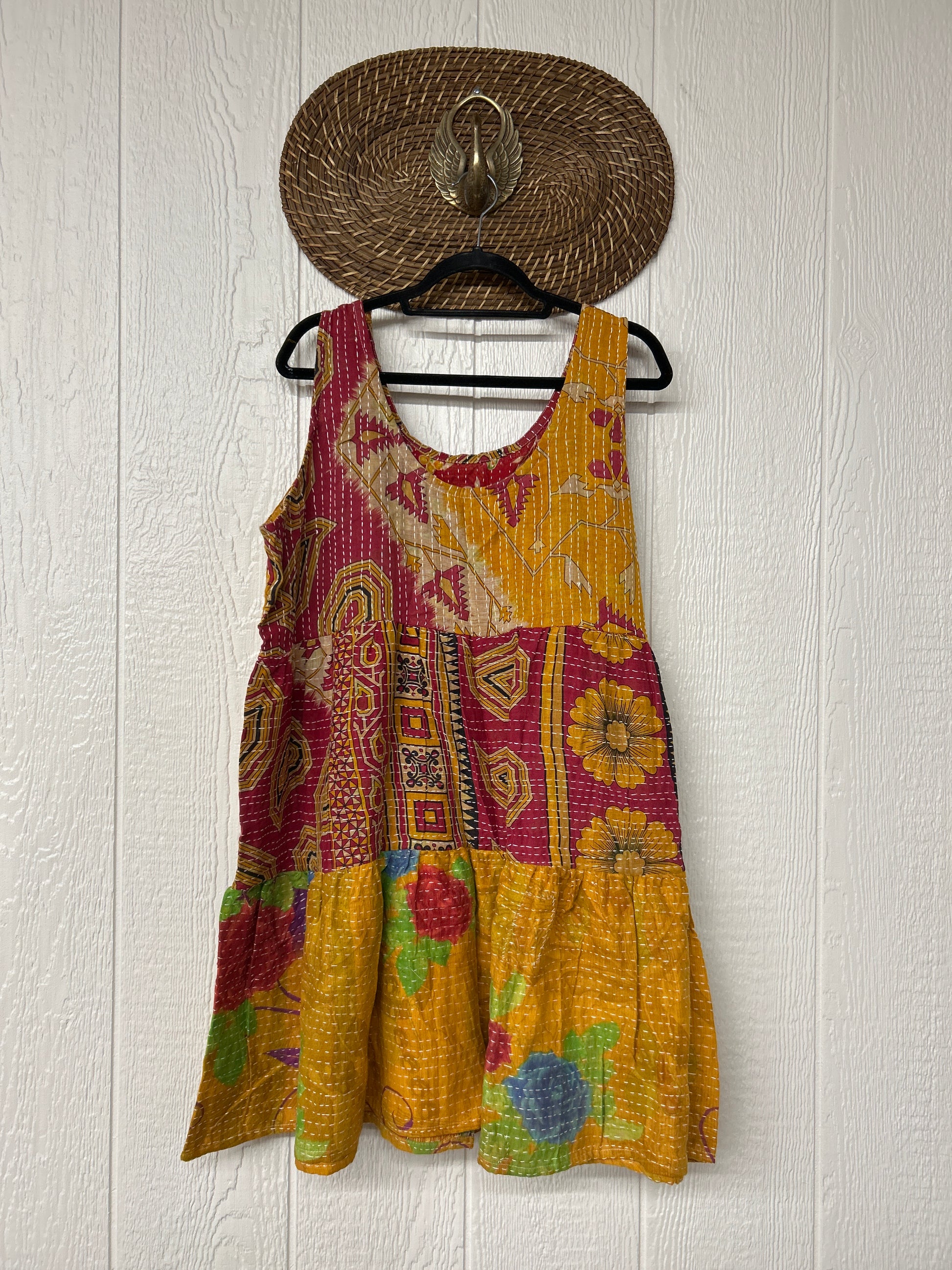 This sweet silhouette is crafted from our ultra lux Kantha stitched cotton sari. The Kantha Meadow Mini Dress features a button closure on the strap, deep interior front pockets, and a tiered bodice for extra twirling dimension!