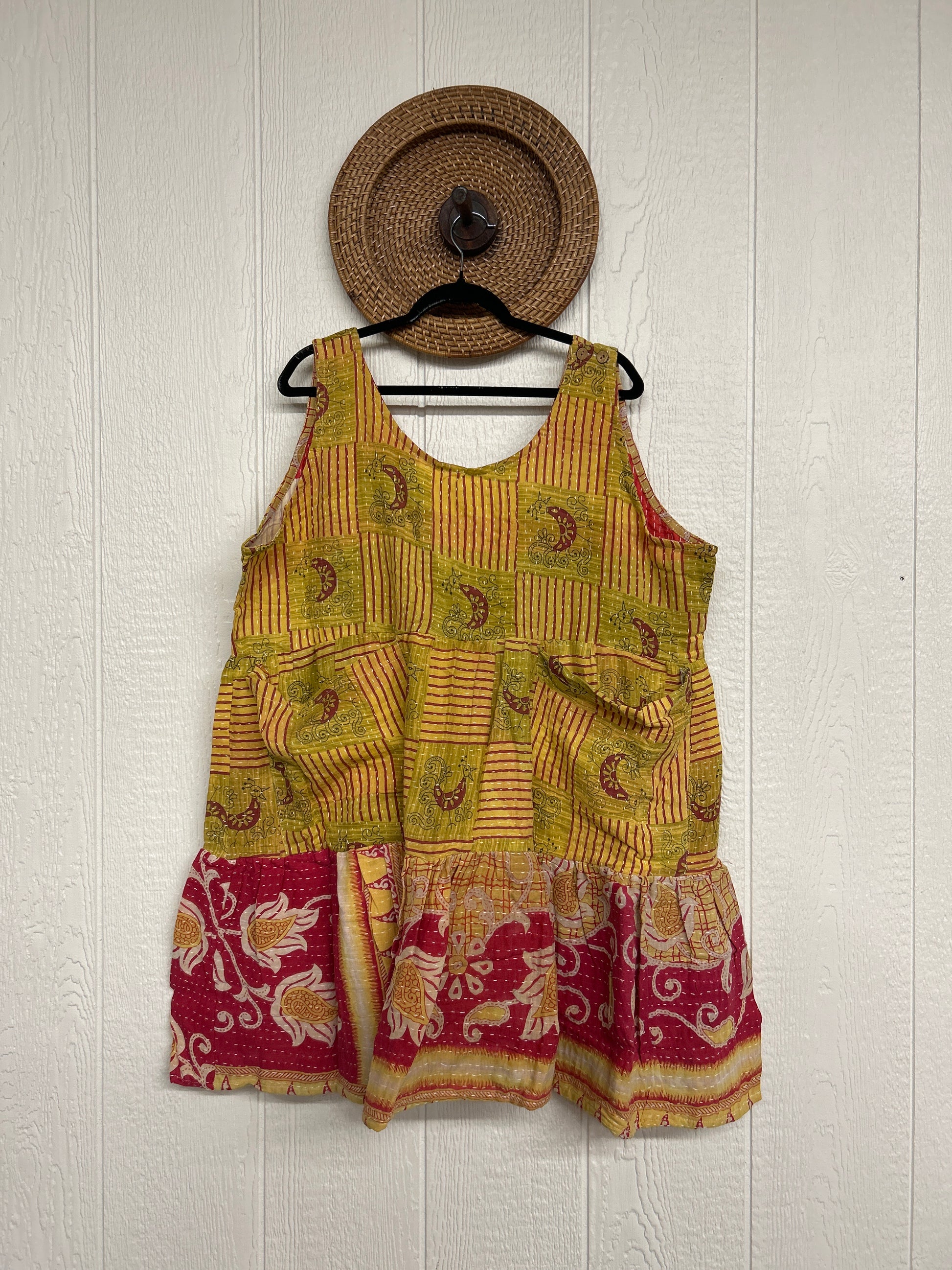 This sweet silhouette is crafted from our ultra lux Kantha stitched cotton sari. The Kantha Meadow Mini Dress features a button closure on the strap, deep interior front pockets, and a tiered bodice for extra twirling dimension!