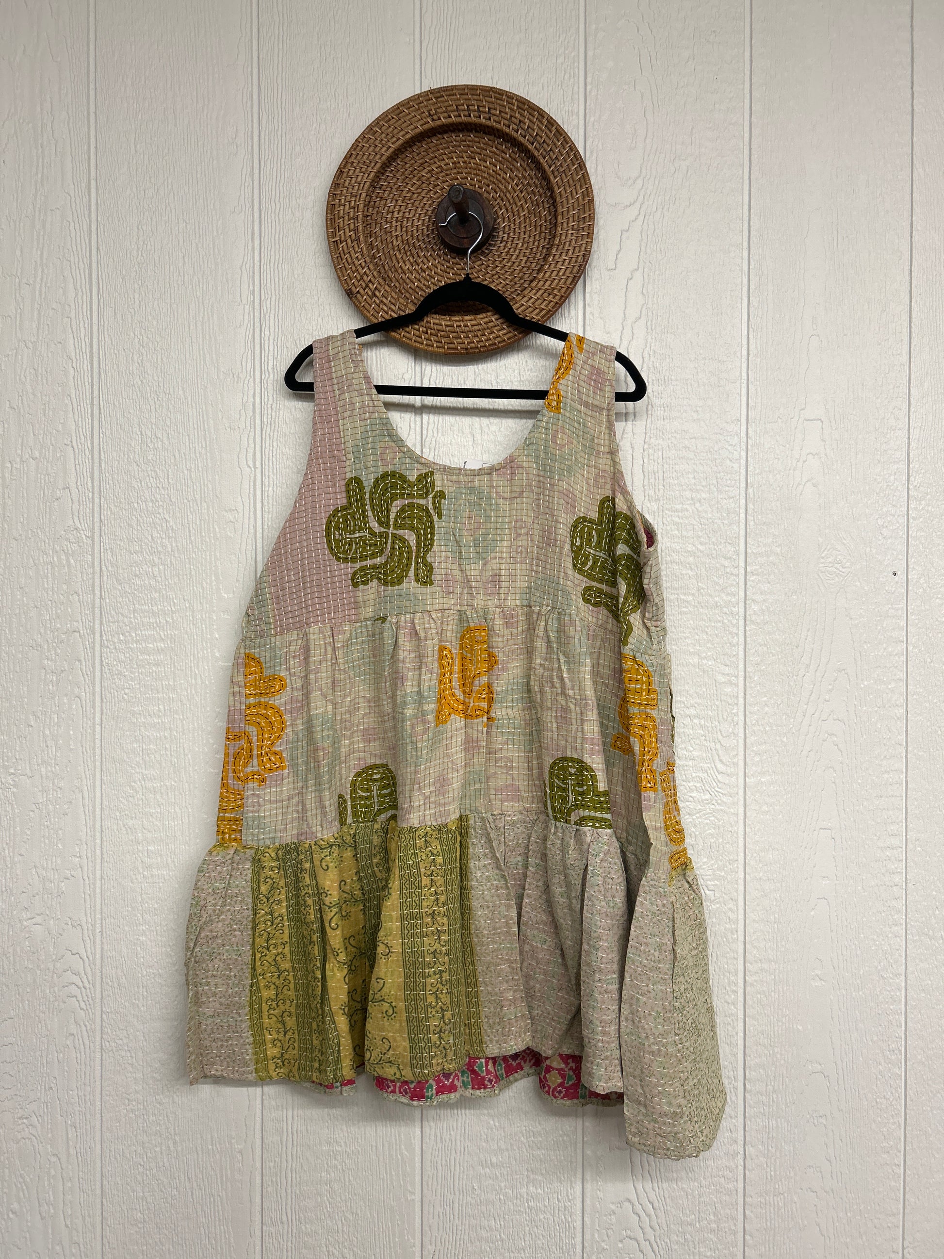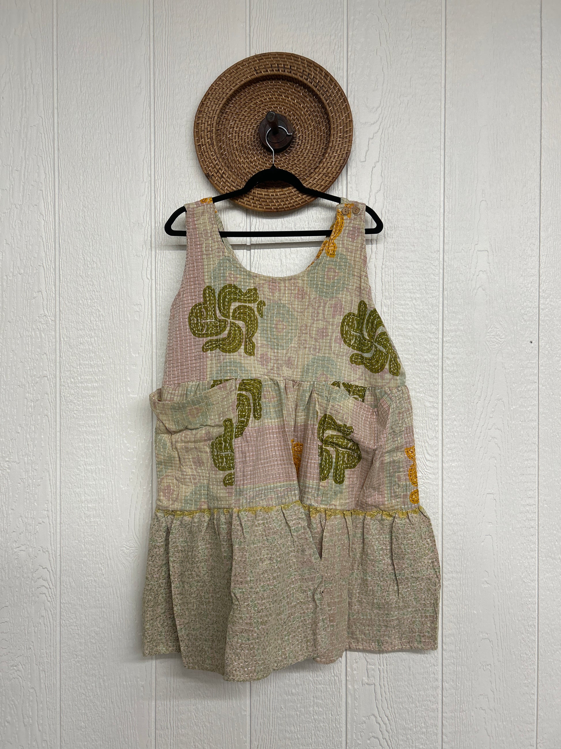 This sweet silhouette is crafted from our ultra lux Kantha stitched cotton sari. The Kantha Meadow Mini Dress features a button closure on the strap, deep interior front pockets, and a tiered bodice for extra twirling dimension!