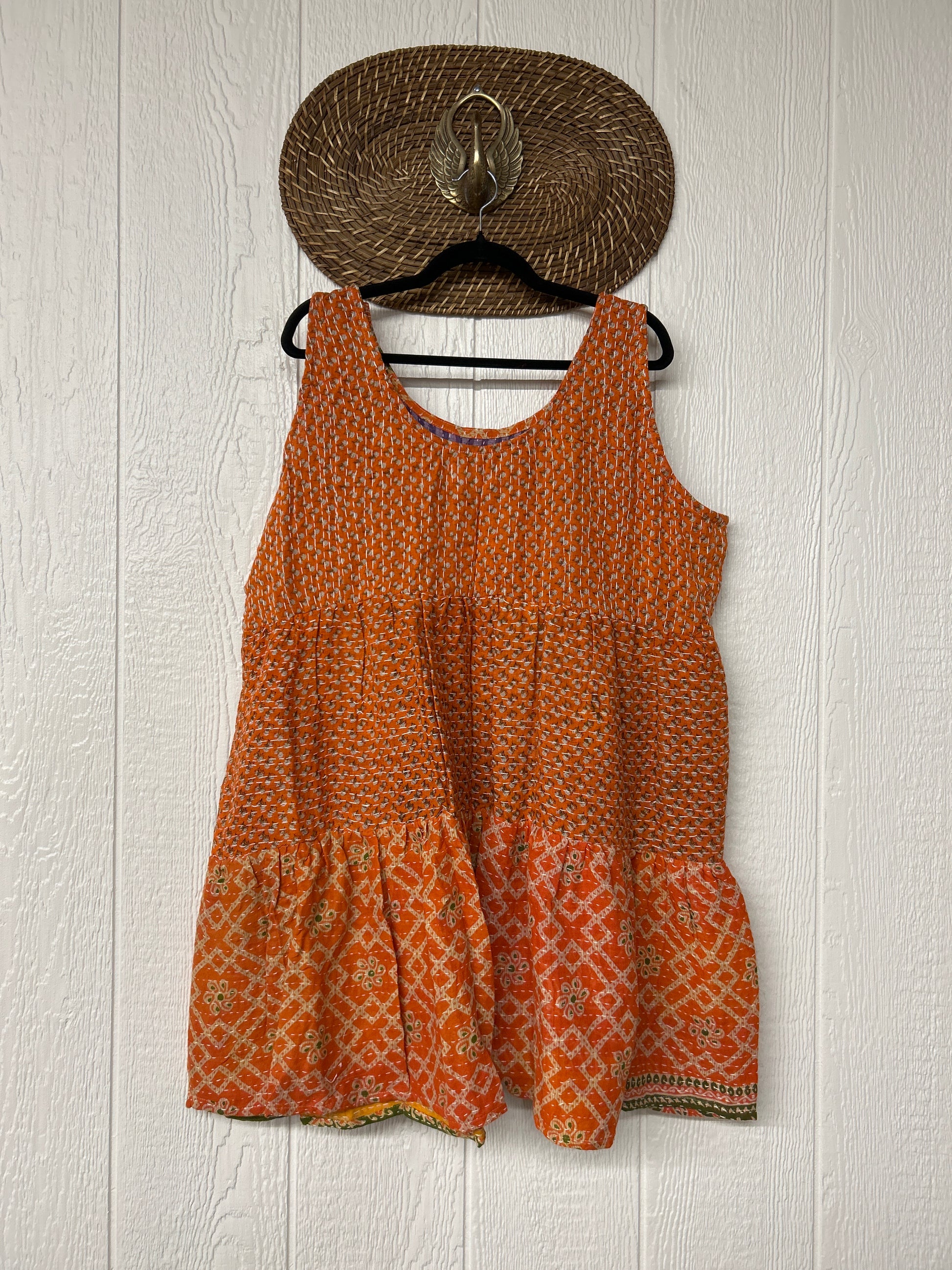 This sweet silhouette is crafted from our ultra lux Kantha stitched cotton sari. The Kantha Meadow Mini Dress features a button closure on the strap, deep interior front pockets, and a tiered bodice for extra twirling dimension!