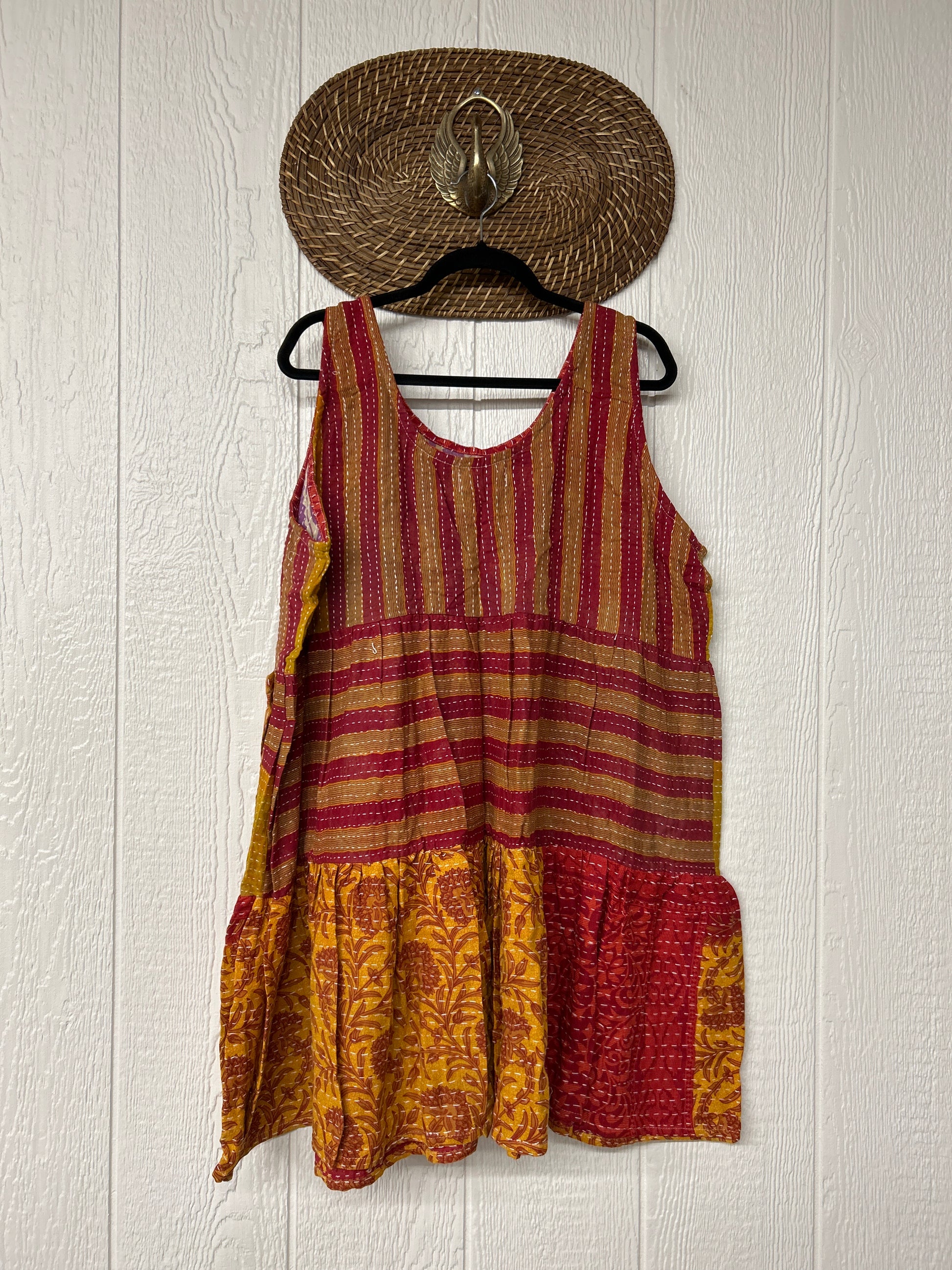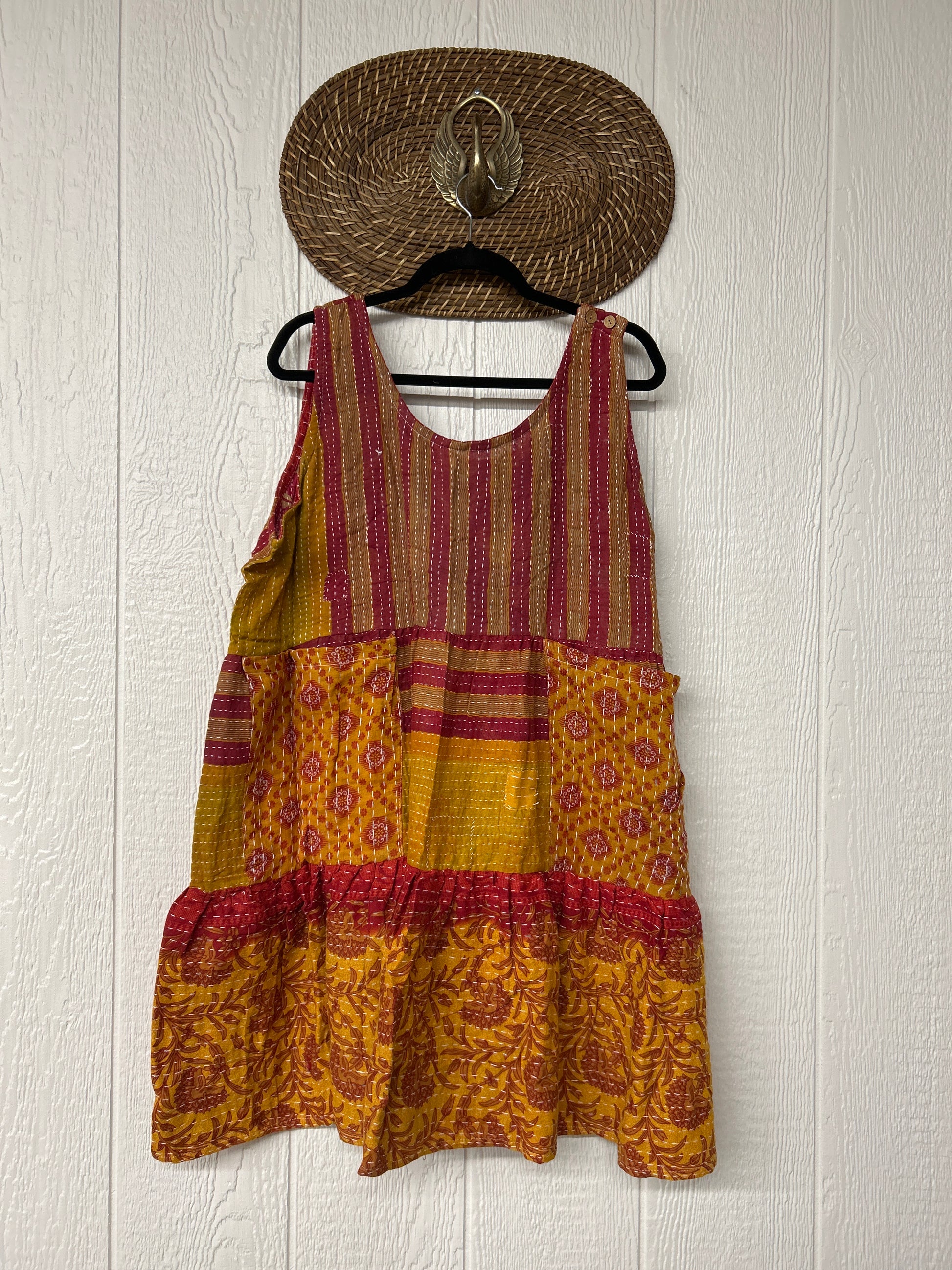 This sweet silhouette is crafted from our ultra lux Kantha stitched cotton sari. The Kantha Meadow Mini Dress features a button closure on the strap, deep interior front pockets, and a tiered bodice for extra twirling dimension!