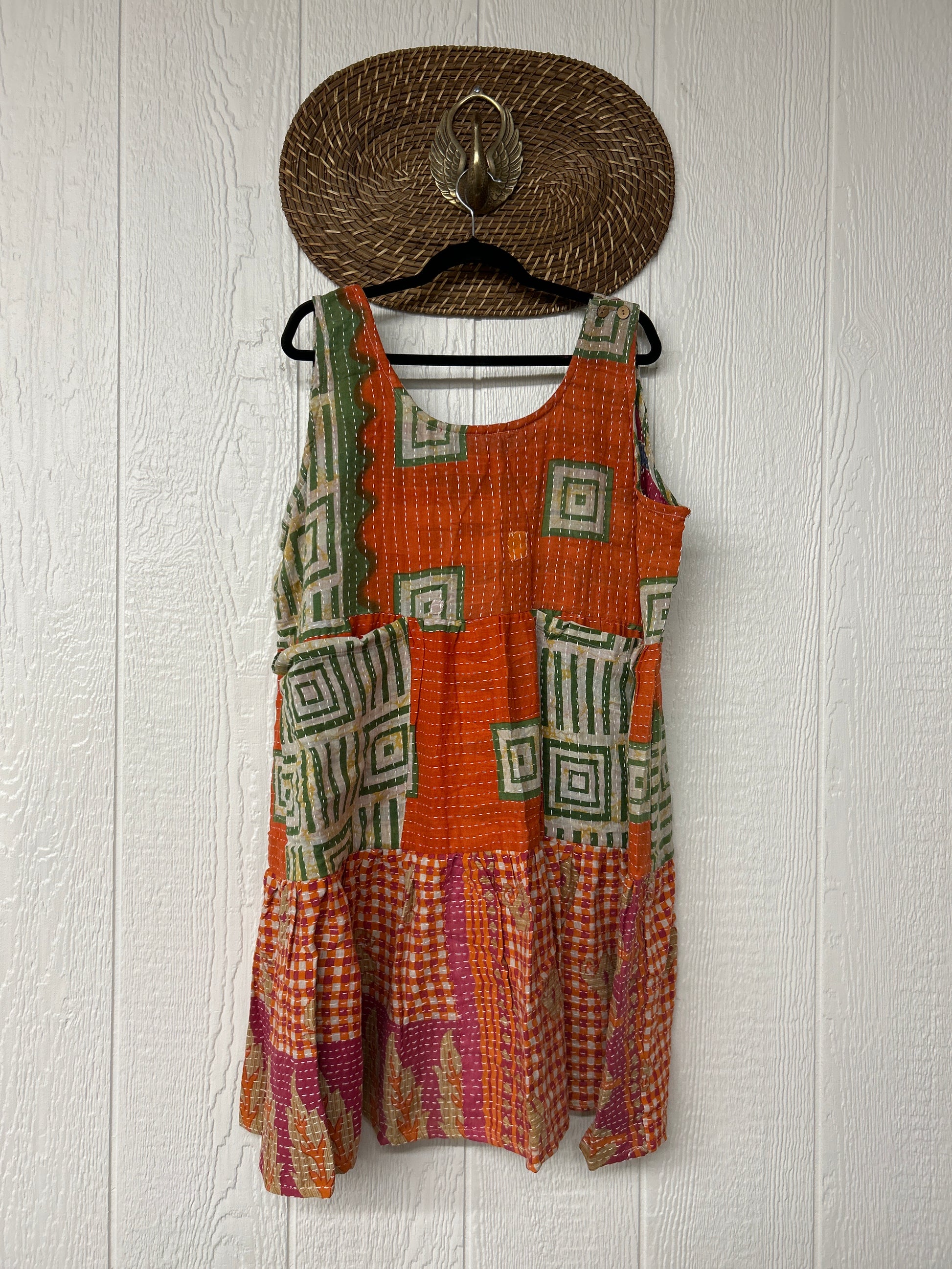 This sweet silhouette is crafted from our ultra lux Kantha stitched cotton sari. The Kantha Meadow Mini Dress features a button closure on the strap, deep interior front pockets, and a tiered bodice for extra twirling dimension!
