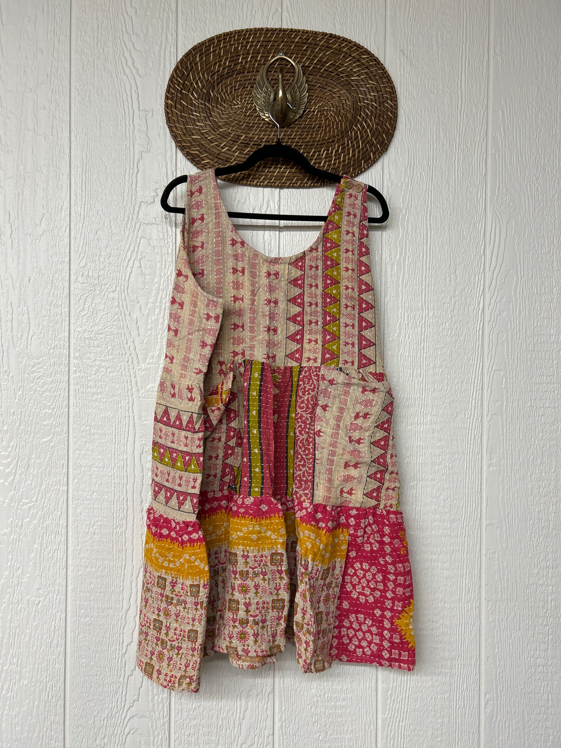 This sweet silhouette is crafted from our ultra lux Kantha stitched cotton sari. The Kantha Meadow Mini Dress features a button closure on the strap, deep interior front pockets, and a tiered bodice for extra twirling dimension!