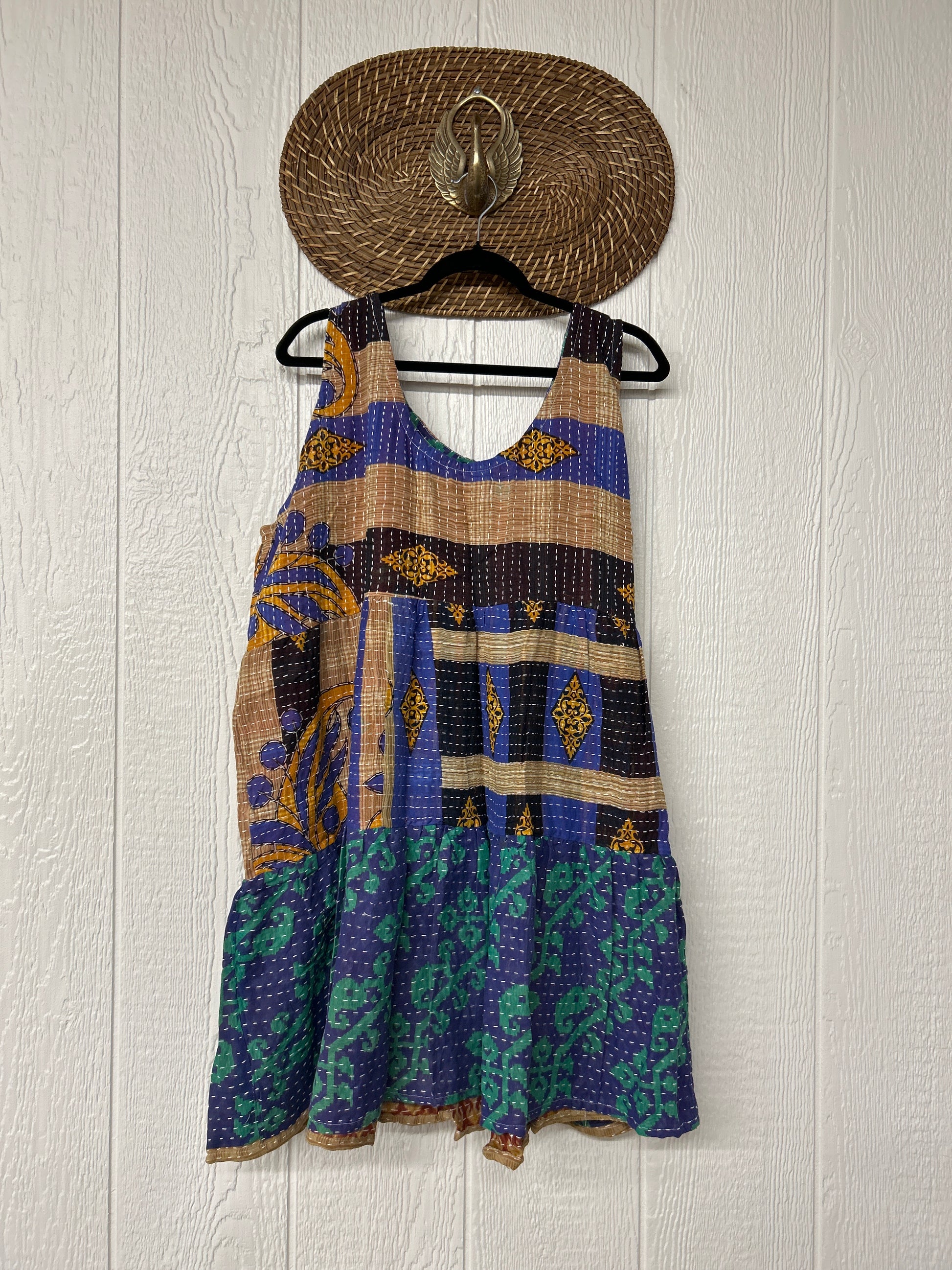 This sweet silhouette is crafted from our ultra lux Kantha stitched cotton sari. The Kantha Meadow Mini Dress features a button closure on the strap, deep interior front pockets, and a tiered bodice for extra twirling dimension!