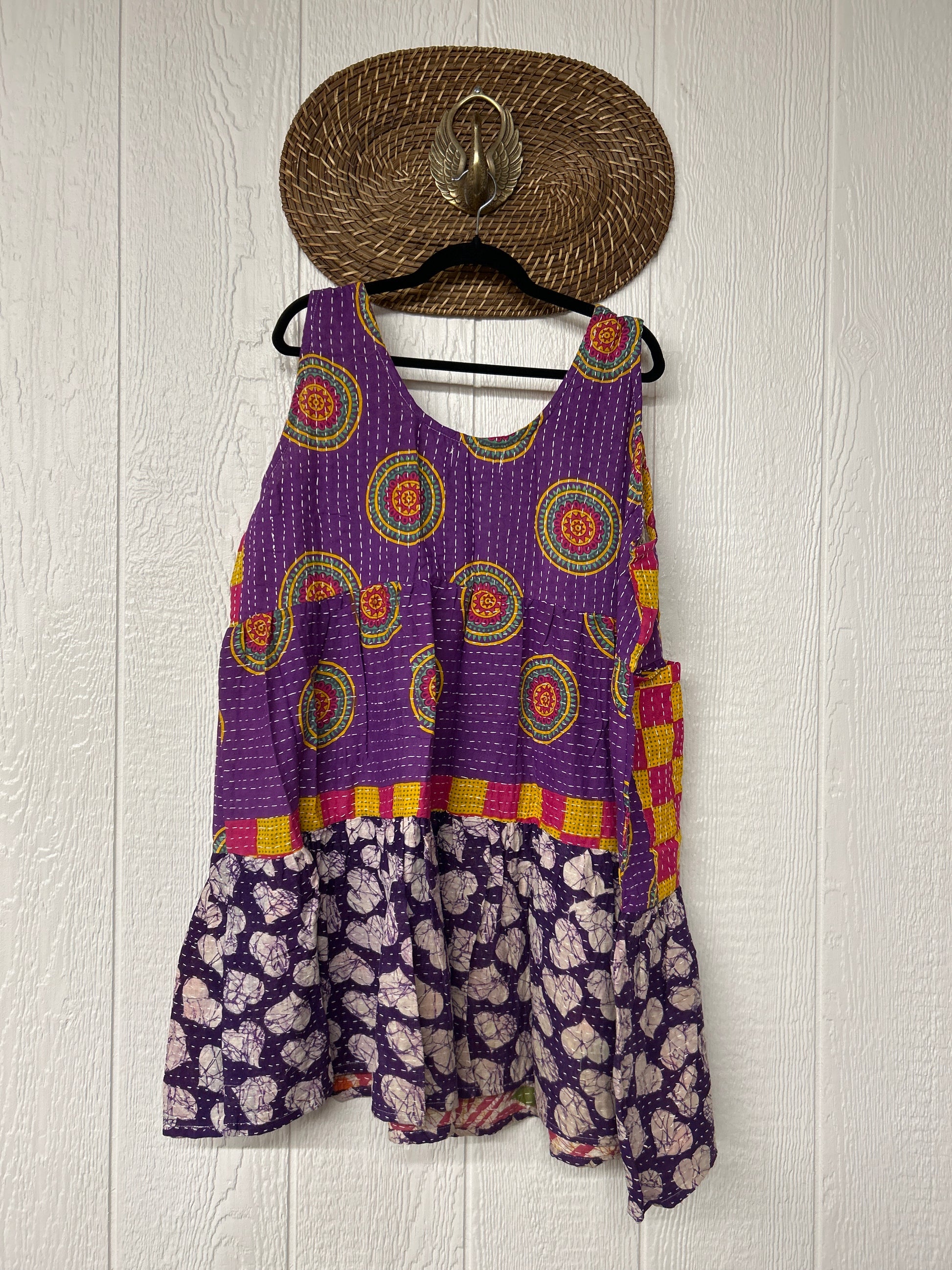 This sweet silhouette is crafted from our ultra lux Kantha stitched cotton sari. The Kantha Meadow Mini Dress features a button closure on the strap, deep interior front pockets, and a tiered bodice for extra twirling dimension!
