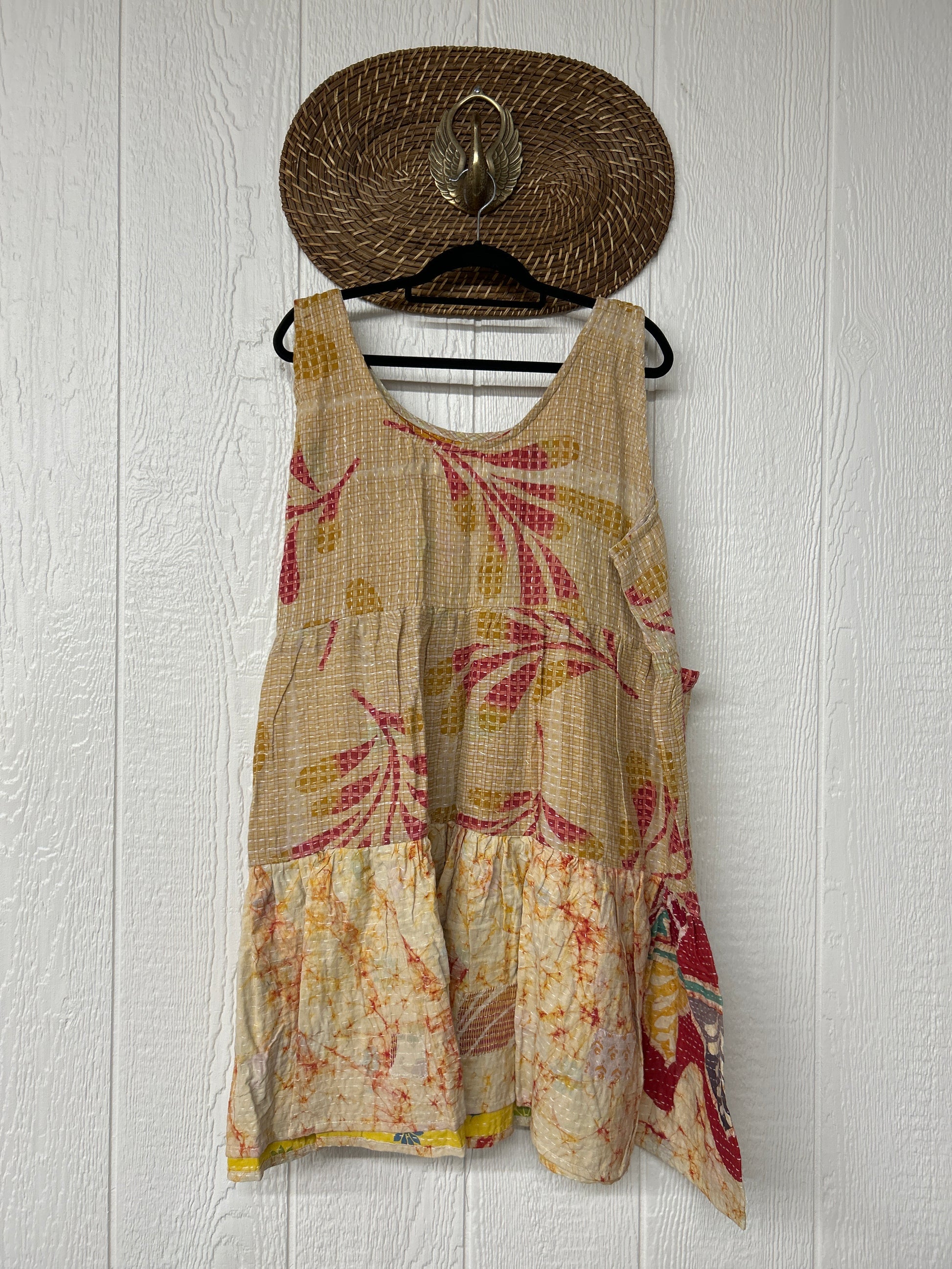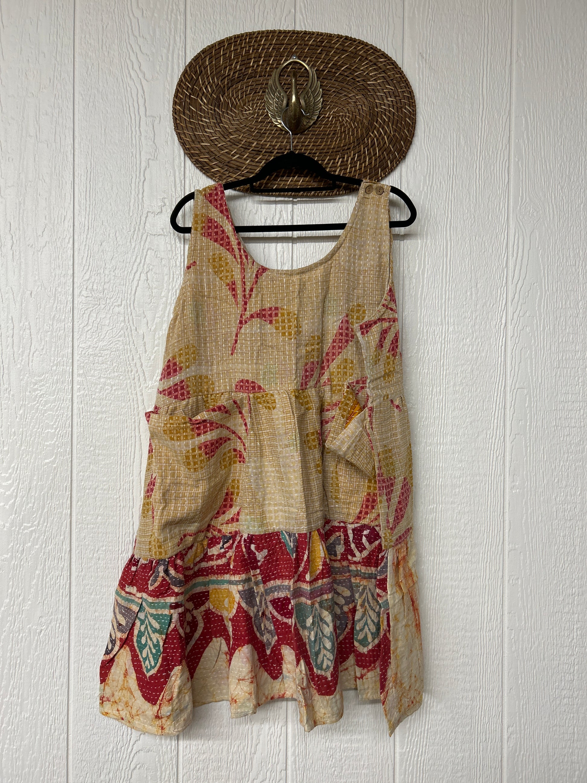 This sweet silhouette is crafted from our ultra lux Kantha stitched cotton sari. The Kantha Meadow Mini Dress features a button closure on the strap, deep interior front pockets, and a tiered bodice for extra twirling dimension!