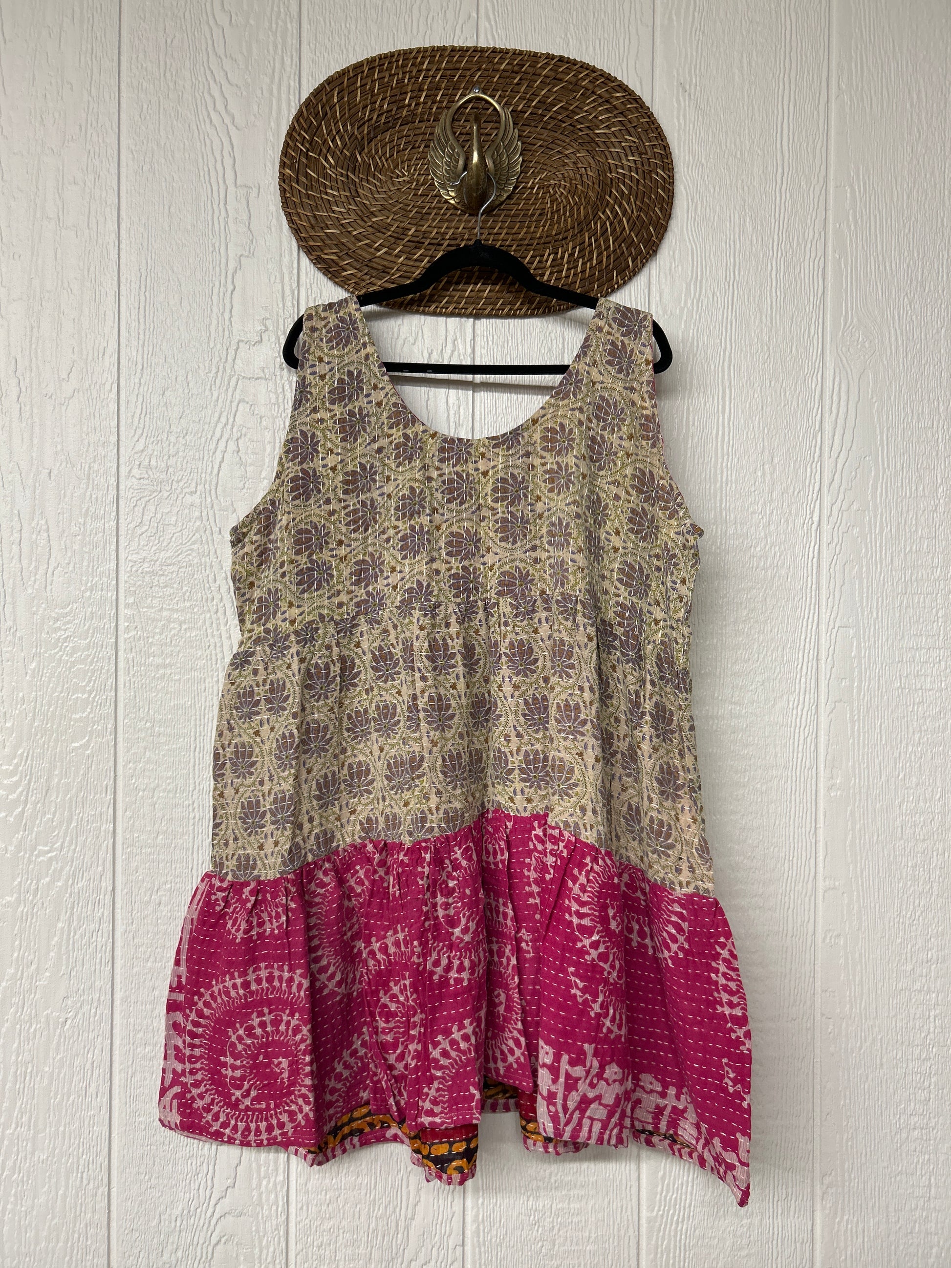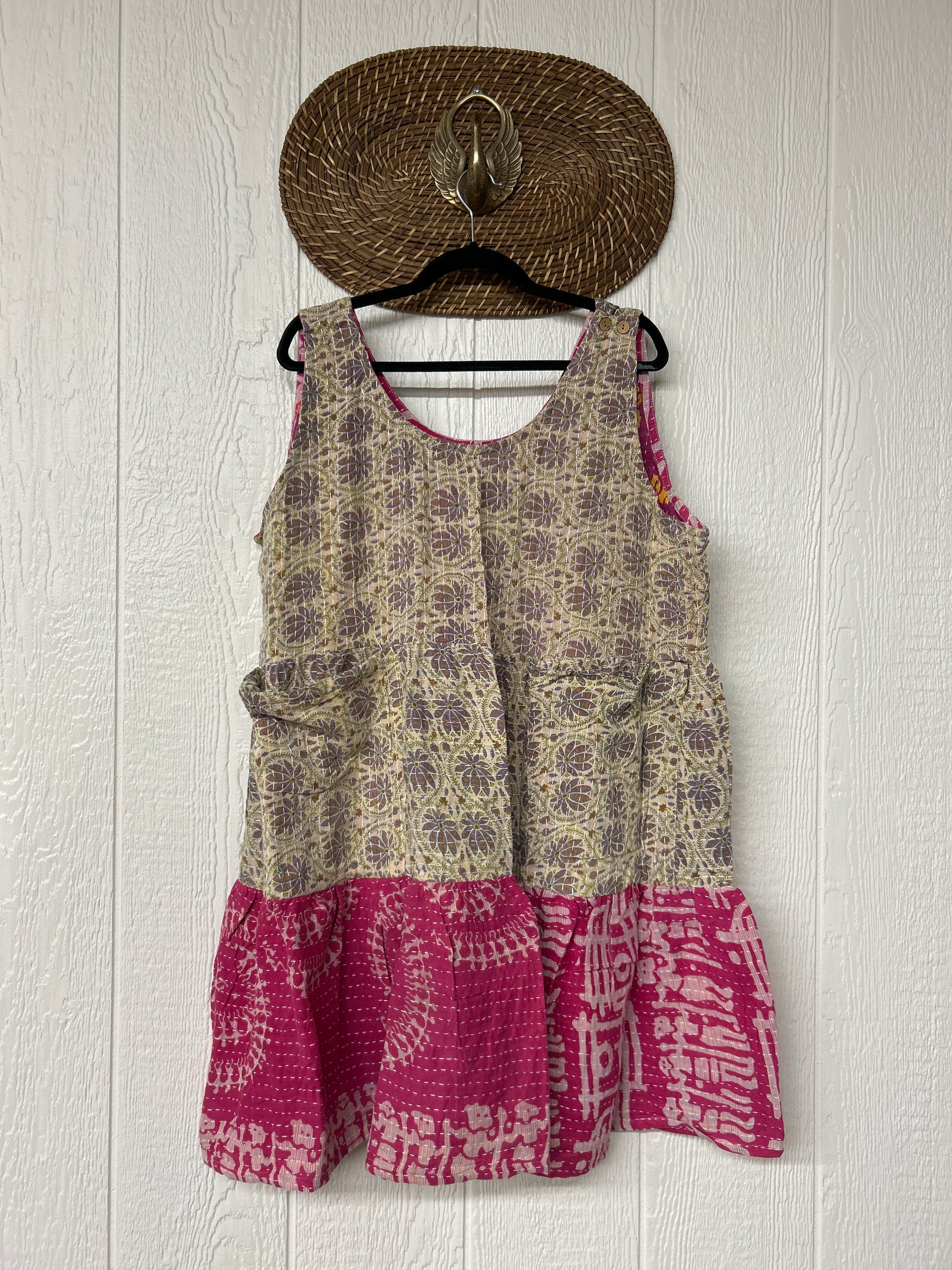 This sweet silhouette is crafted from our ultra lux Kantha stitched cotton sari. The Kantha Meadow Mini Dress features a button closure on the strap, deep interior front pockets, and a tiered bodice for extra twirling dimension!
