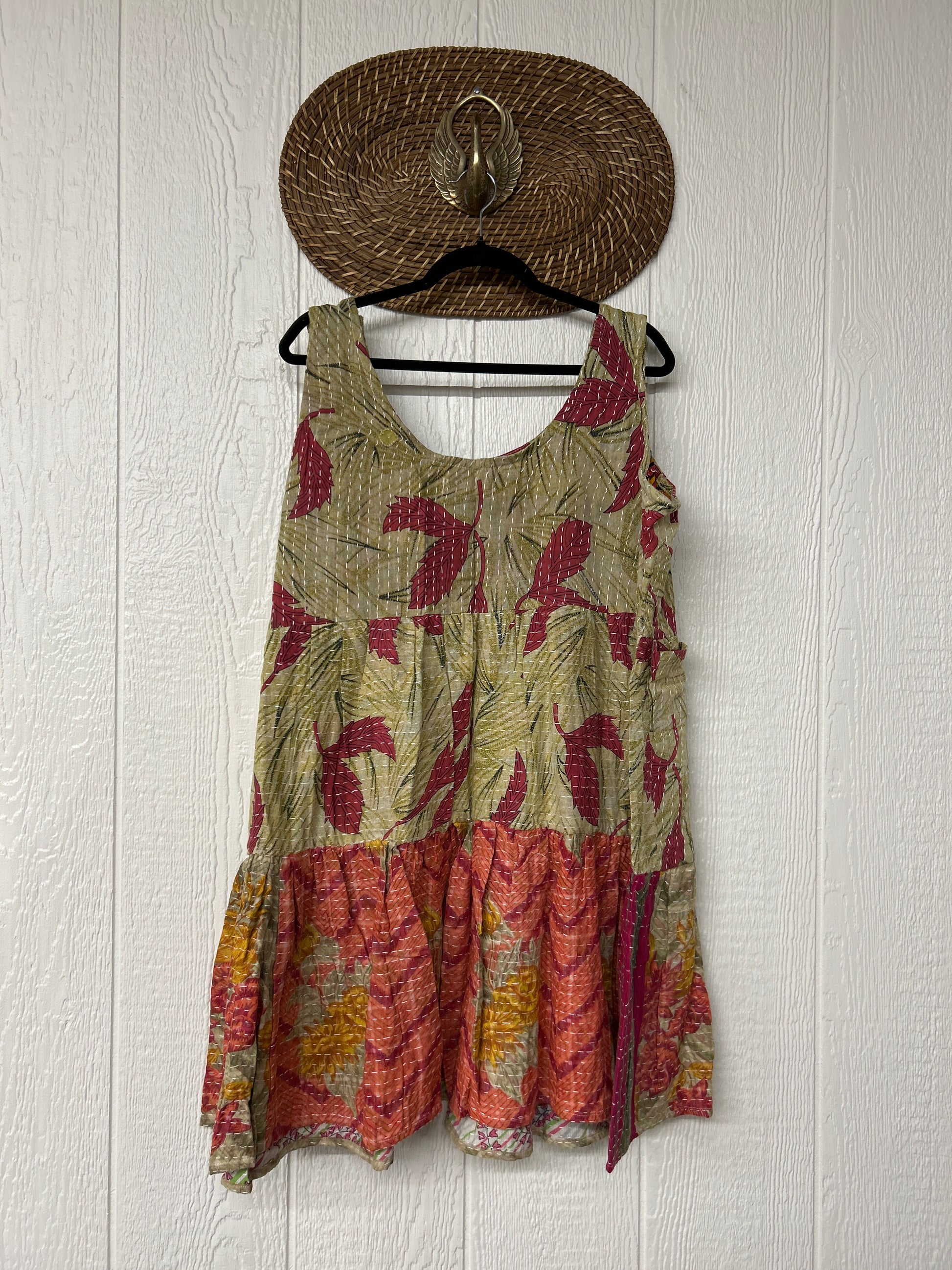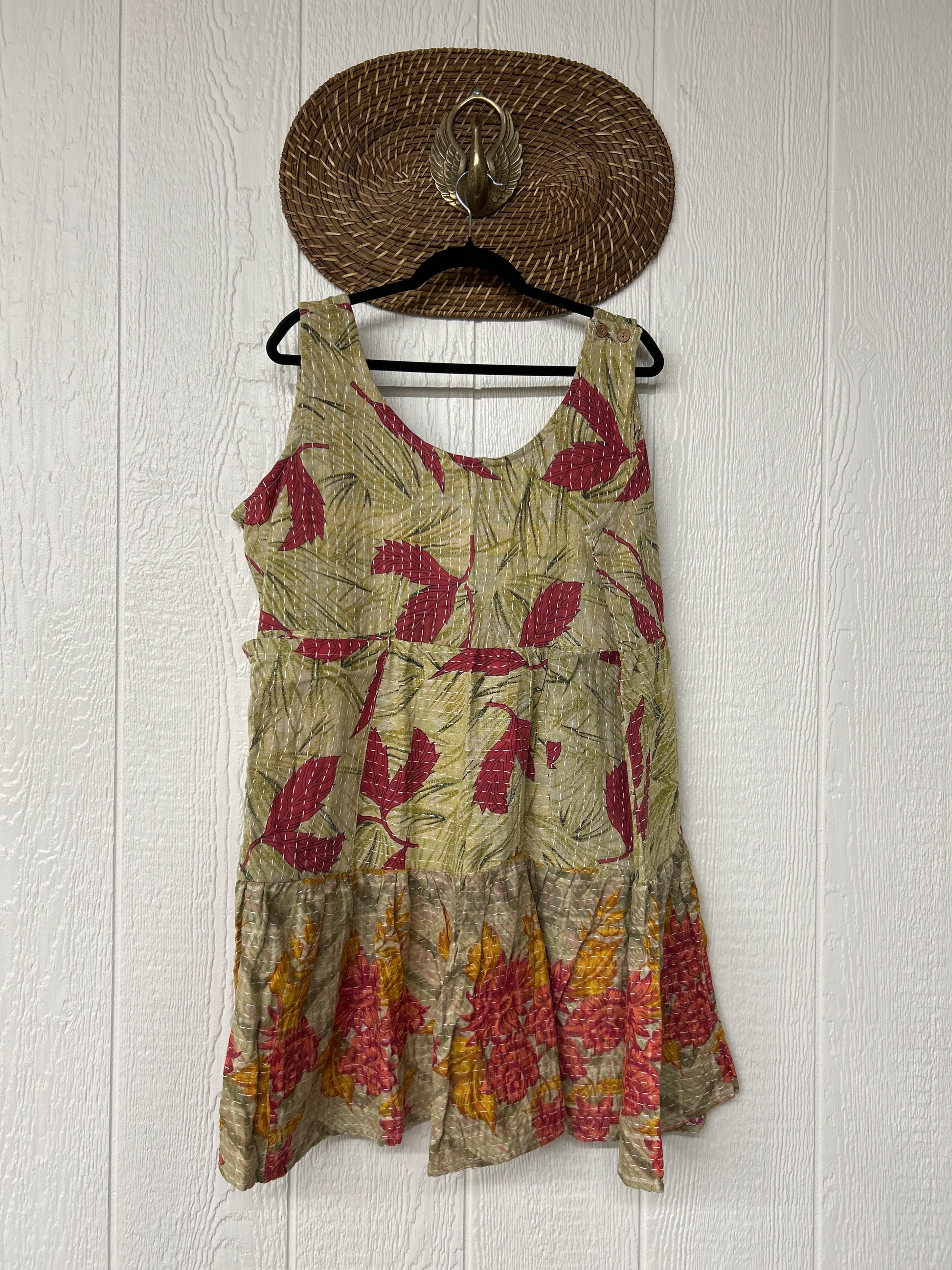 This sweet silhouette is crafted from our ultra lux Kantha stitched cotton sari. The Kantha Meadow Mini Dress features a button closure on the strap, deep interior front pockets, and a tiered bodice for extra twirling dimension!