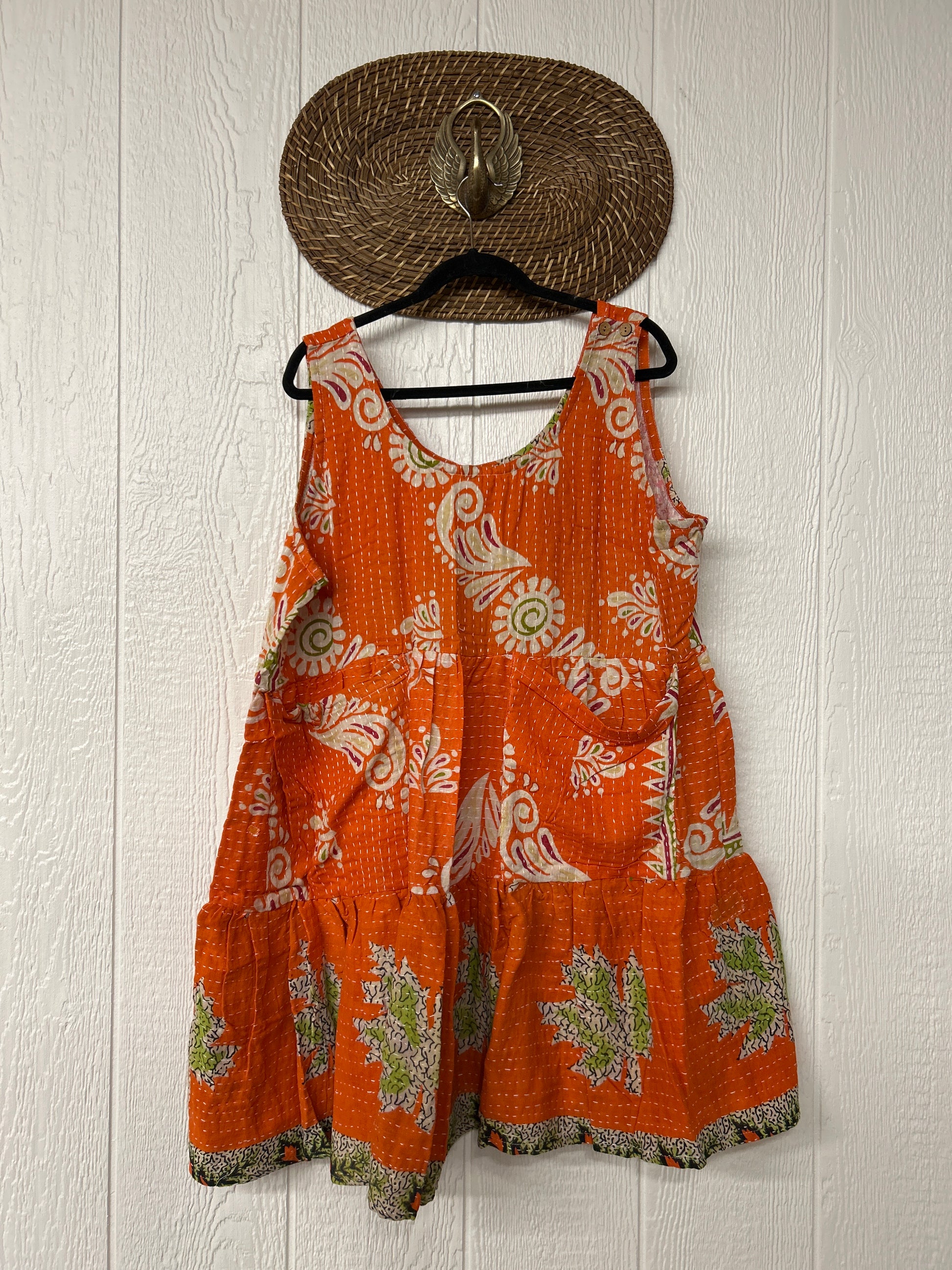 This sweet silhouette is crafted from our ultra lux Kantha stitched cotton sari. The Kantha Meadow Mini Dress features a button closure on the strap, deep interior front pockets, and a tiered bodice for extra twirling dimension!