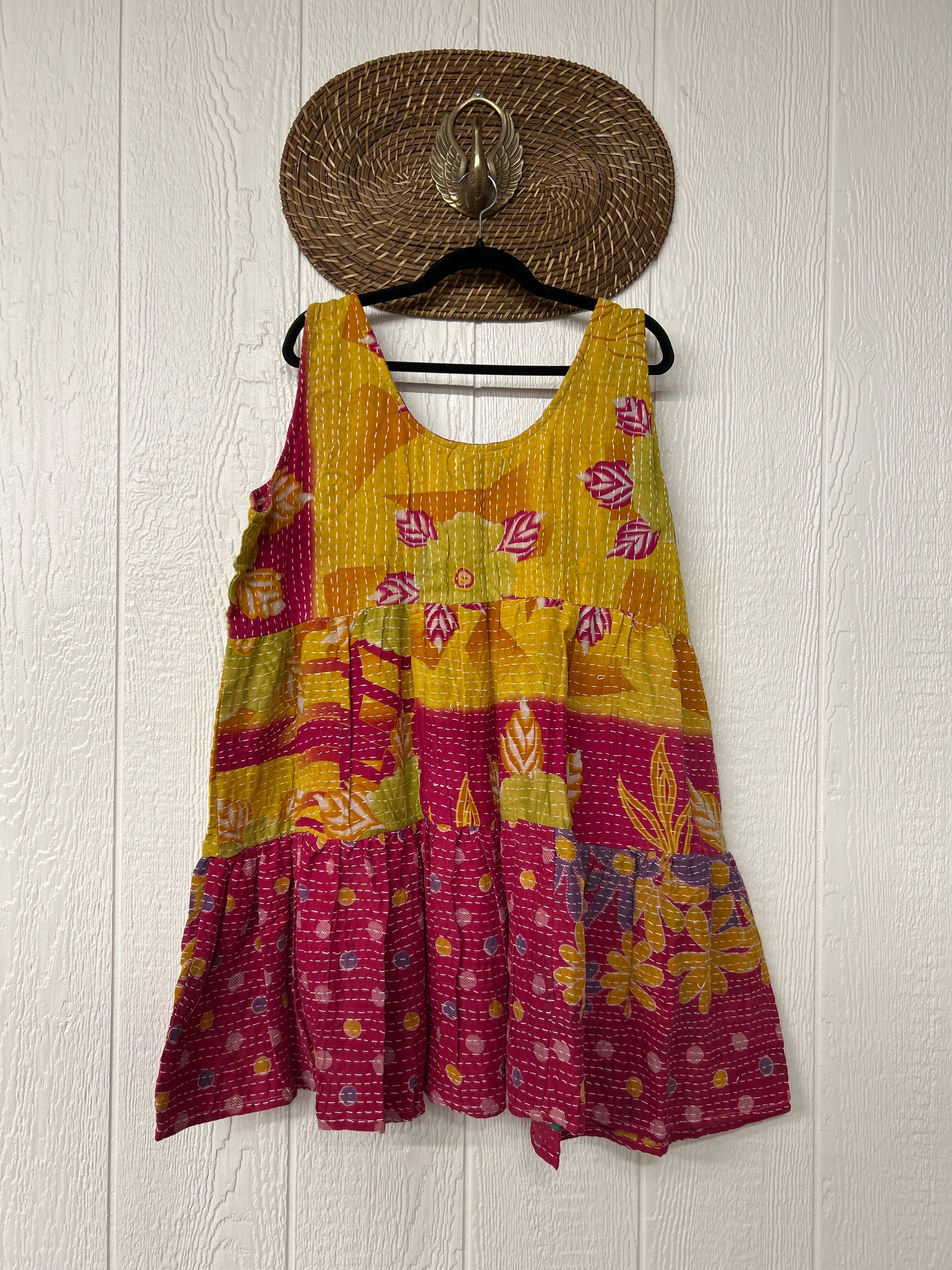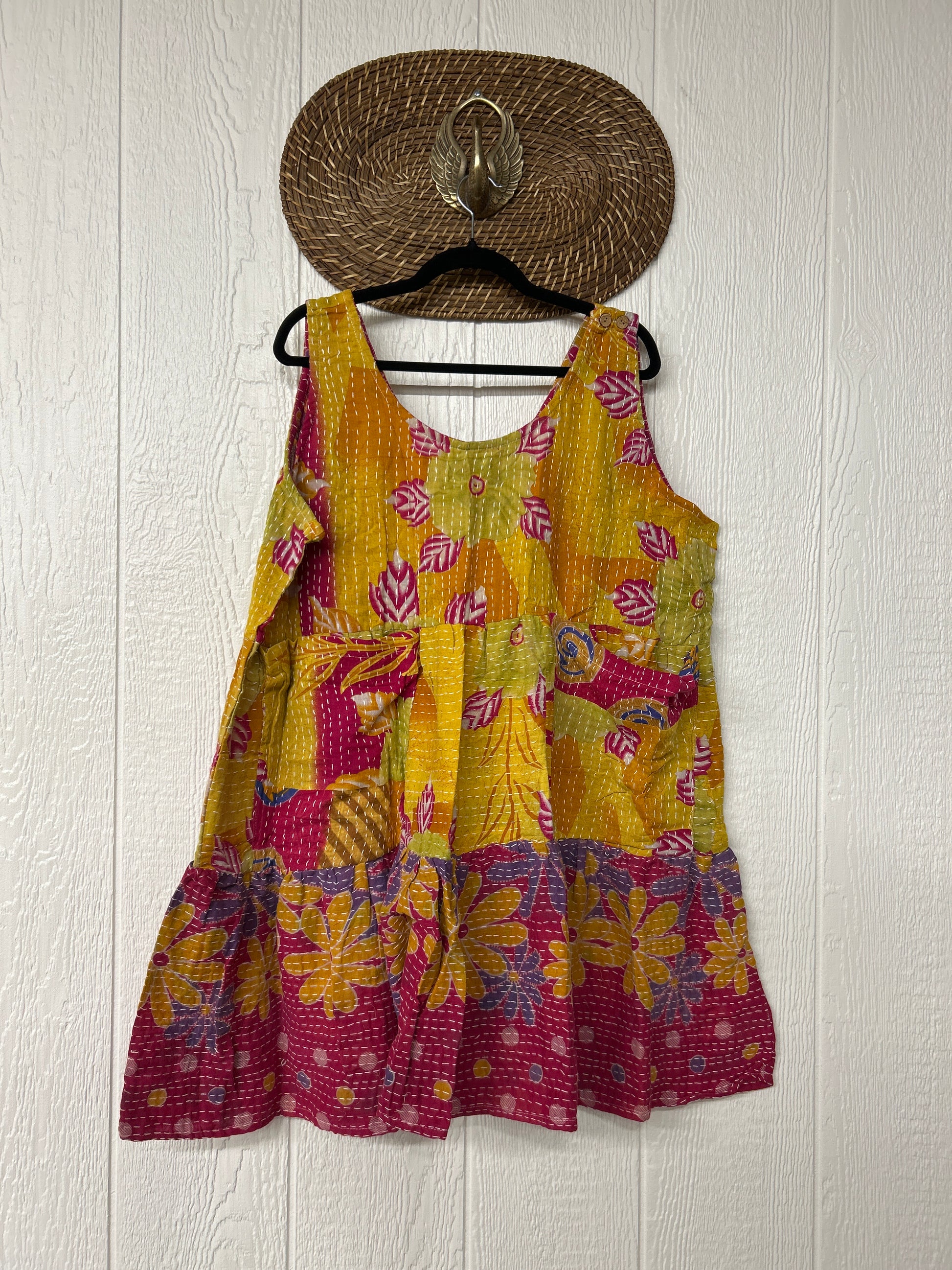 This sweet silhouette is crafted from our ultra lux Kantha stitched cotton sari. The Kantha Meadow Mini Dress features a button closure on the strap, deep interior front pockets, and a tiered bodice for extra twirling dimension!