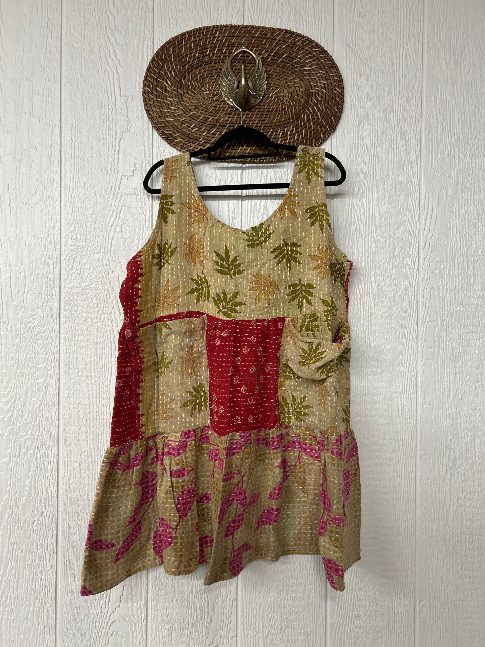 This sweet silhouette is crafted from our ultra lux Kantha stitched cotton sari. The Kantha Meadow Mini Dress features a button closure on the strap, deep interior front pockets, and a tiered bodice for extra twirling dimension!
