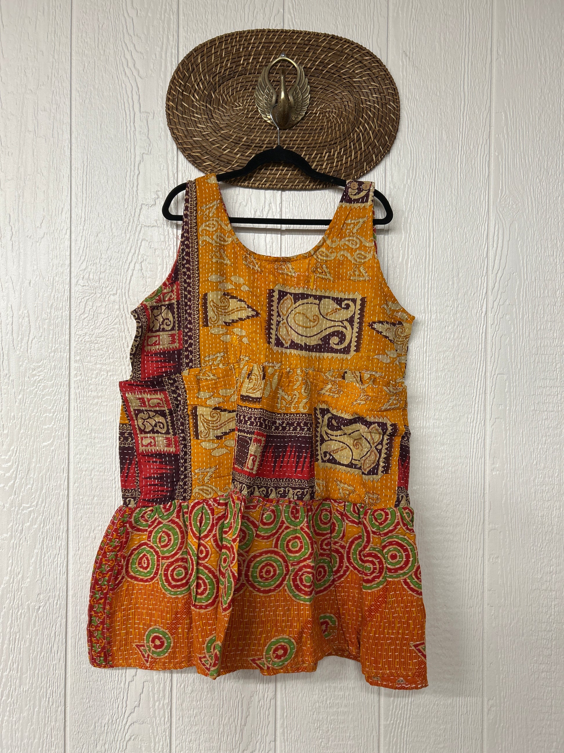This sweet silhouette is crafted from our ultra lux Kantha stitched cotton sari. The Kantha Meadow Mini Dress features a button closure on the strap, deep interior front pockets, and a tiered bodice for extra twirling dimension!