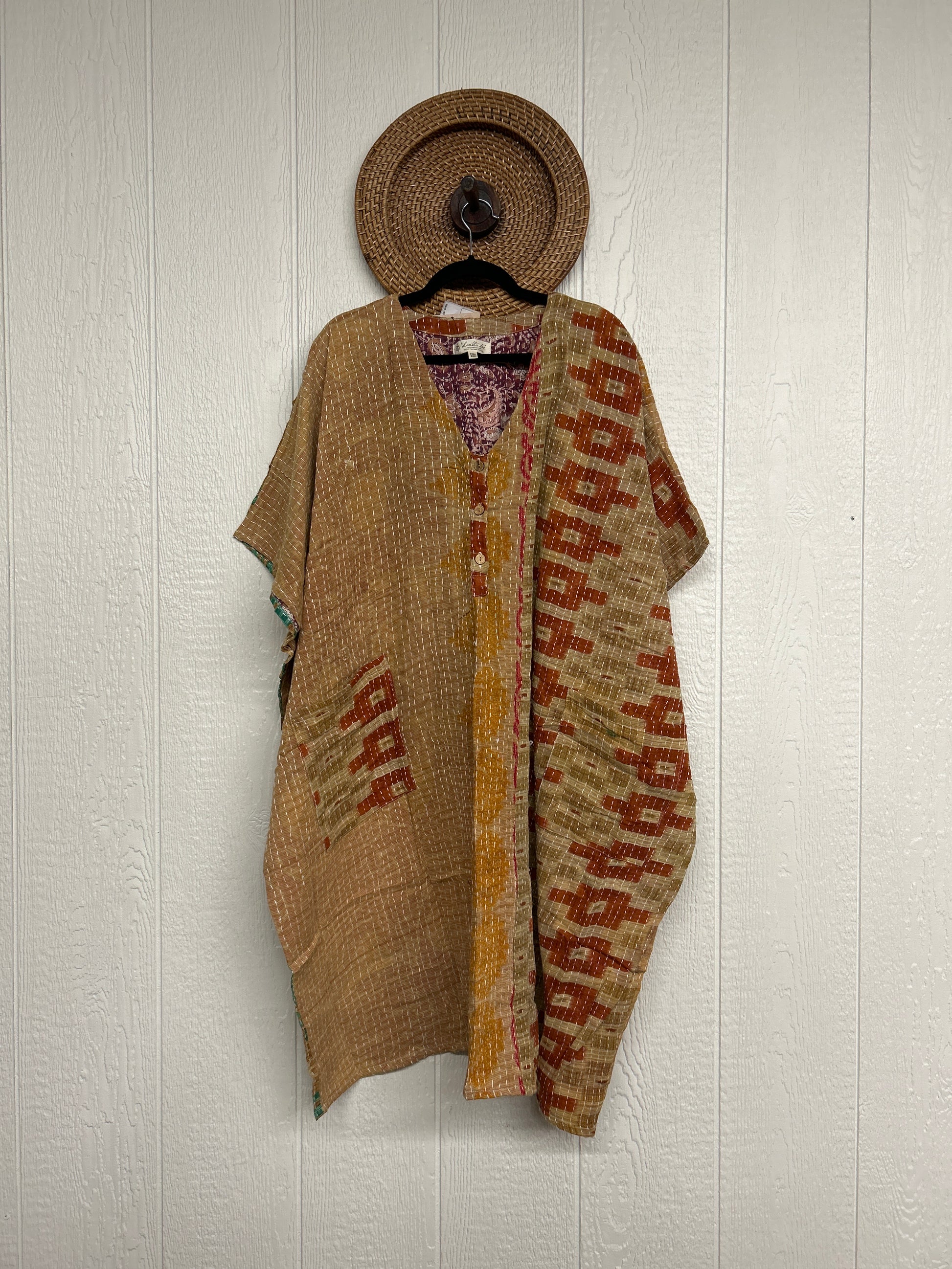 Crafted in our lux vintage Kantha stitch cotton sari, this floaty muu is in a new midi length with buttons at the neckline and slouchy exterior pockets.