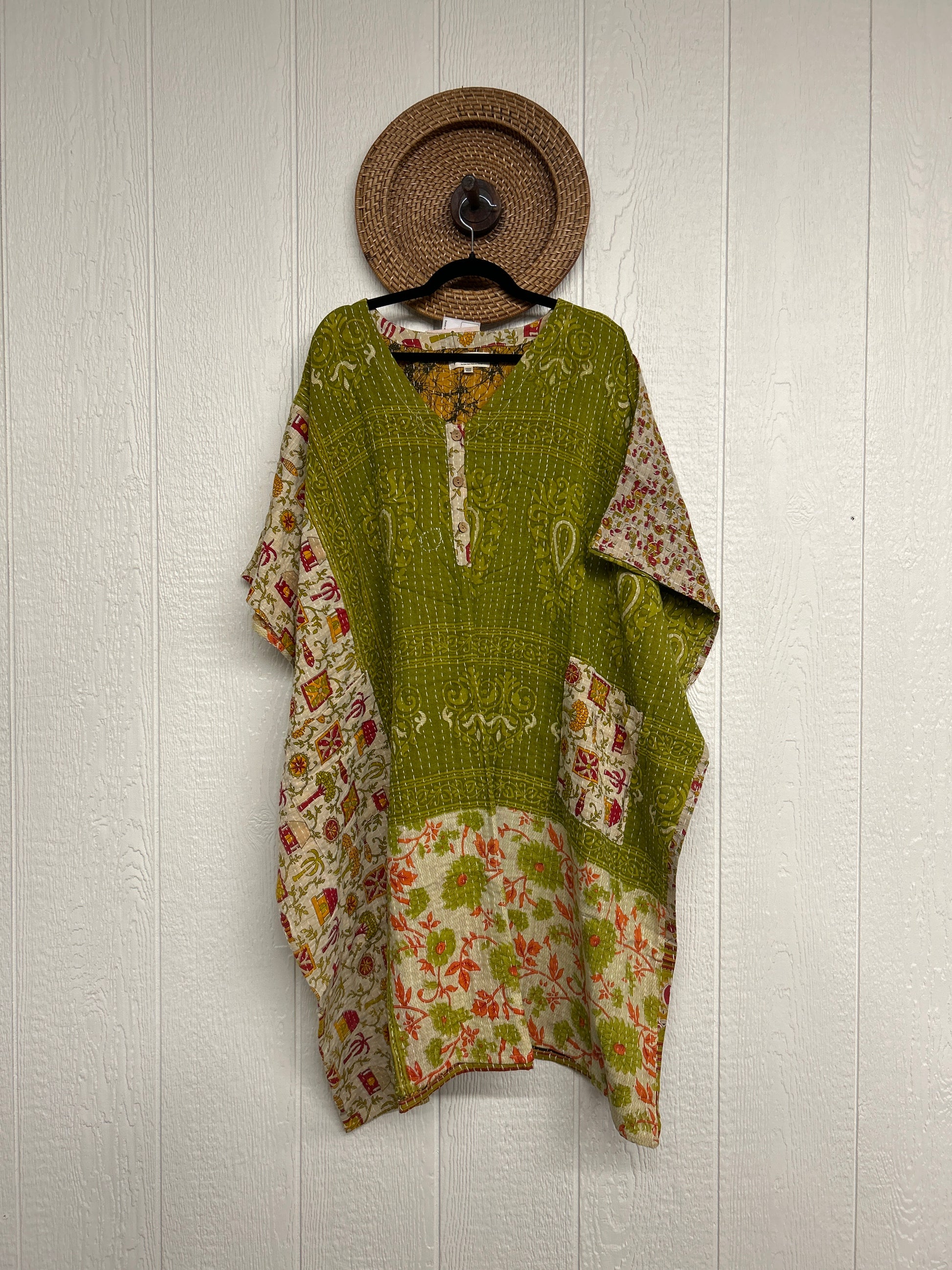 Crafted in our lux vintage Kantha stitch cotton sari, this floaty muu is in a new midi length with buttons at the neckline and slouchy exterior pockets.